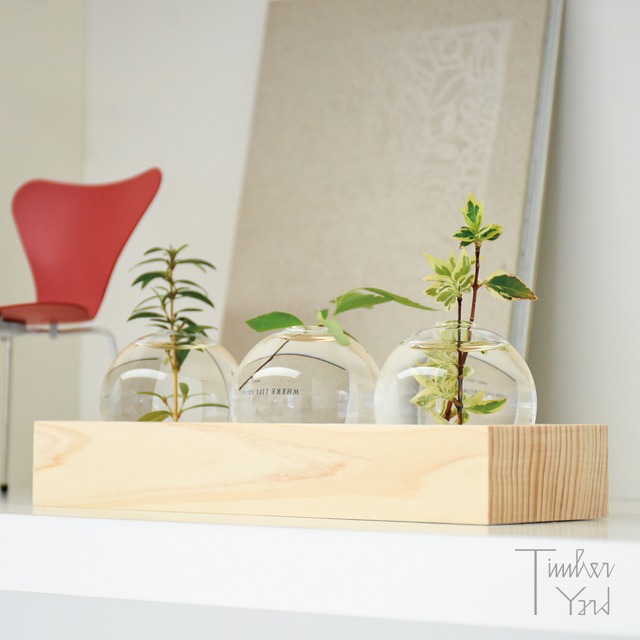\暮らしに小さな安らぎを/ La luz Inc.|Wood Flower Vase|triple[Natural(ヒノキ)] 【ちょっとしたスペースに◎】 丸いガラスと木の台座がベストマッチな可愛らしいウッドフラワーベース。まさに野に咲く花も主役にしてくれるようなそんなフラワーベースです。洗面台の横、棚の上、キッチン、ダイニング・リビングテーブルなどちょこっとしたスペースに彩りを与えてくれます。 【トレイとしても】 ガラスボールを外してアクセサリーなどの小物を入れるトレイとして使用することもできます。 【お水はたっぷりと】 手のひらに収まるコロンとしたガラス玉。お水を半分までにしてしまうと気付くと水垢で白く汚れてしまいます。口の小さなガラス玉の中を洗うのはなかなか難しいのです…。ですので、ガラス玉に水を入れるときには”口のぎりぎりまで”入れるときれいにご使用いただけますよ◎ ▼その他のカラー・サイズ https://timberyard.buyshop.jp/search?q=Wood+Flower+Vase ———————————————— ▼商品情報 ブランド:La luz Inc./ラ・ルース サイズ:台座|W200mm D60mm H65mm ガラス玉|Φ52mm×3 樹 種:ヒノキ(CNF+オイル塗装) 品 番:102120 ———————————————— ▼ご購入前にお読みください ・天然ひのき特有の脂(ヤニ)が出てくる場合がございますが、ヤニは汚れではなく雑菌の繁殖を抑える効果があります。木の持つ特性であることをご理解ください。 ———————————————— ▼ご注意ください ・ガラスに気泡や細かい傷が見られる場合がございますが良品となります。ご了承ください。 ・強い衝撃を与えると割れる場合がございますのでご注意ください。 ・塗装を施してあるものは、強くこすると塗装が薄くなったりはがれる場合がございますのでご注意ください。 ・本製品は木製品のため、ぬれたものなどをのせたり、入れると割れや変形、カビなどが生じる可能性があります。ご使用の際にはご注意ください。 ・本製品は天然素材のため、性質上の節や木目がありますが木の特性としてご理解ください。またわずかな欠けが見られる場合がございます。 ———————————————— #フラワーベース #花器 #ラ・ルース #ラルース #la luz #ウッドフラワーベース ★ころんとしたガラスの玉はまるでお水が形を保っているみたいで少し神秘的です。