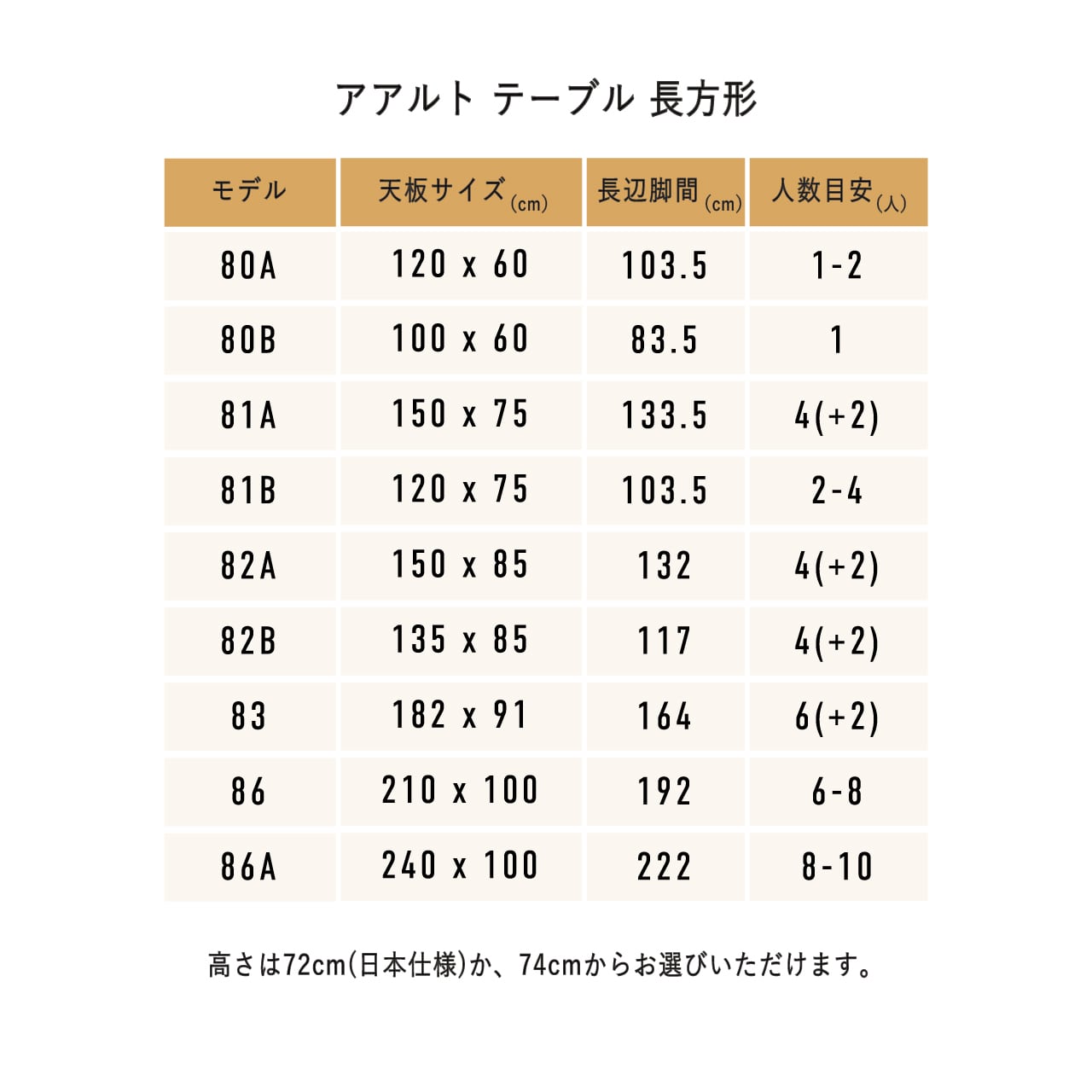 サイズ:W75xD75×H72 / 74 cm(脚間:58.5cm、天板の厚さ:4cm)