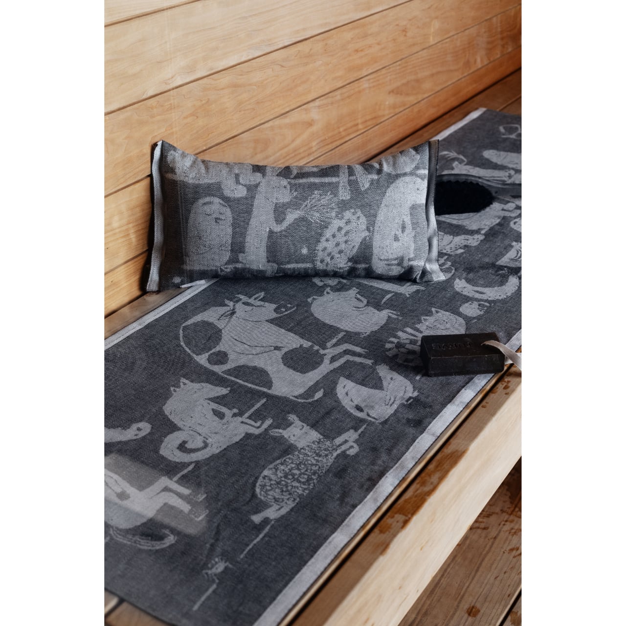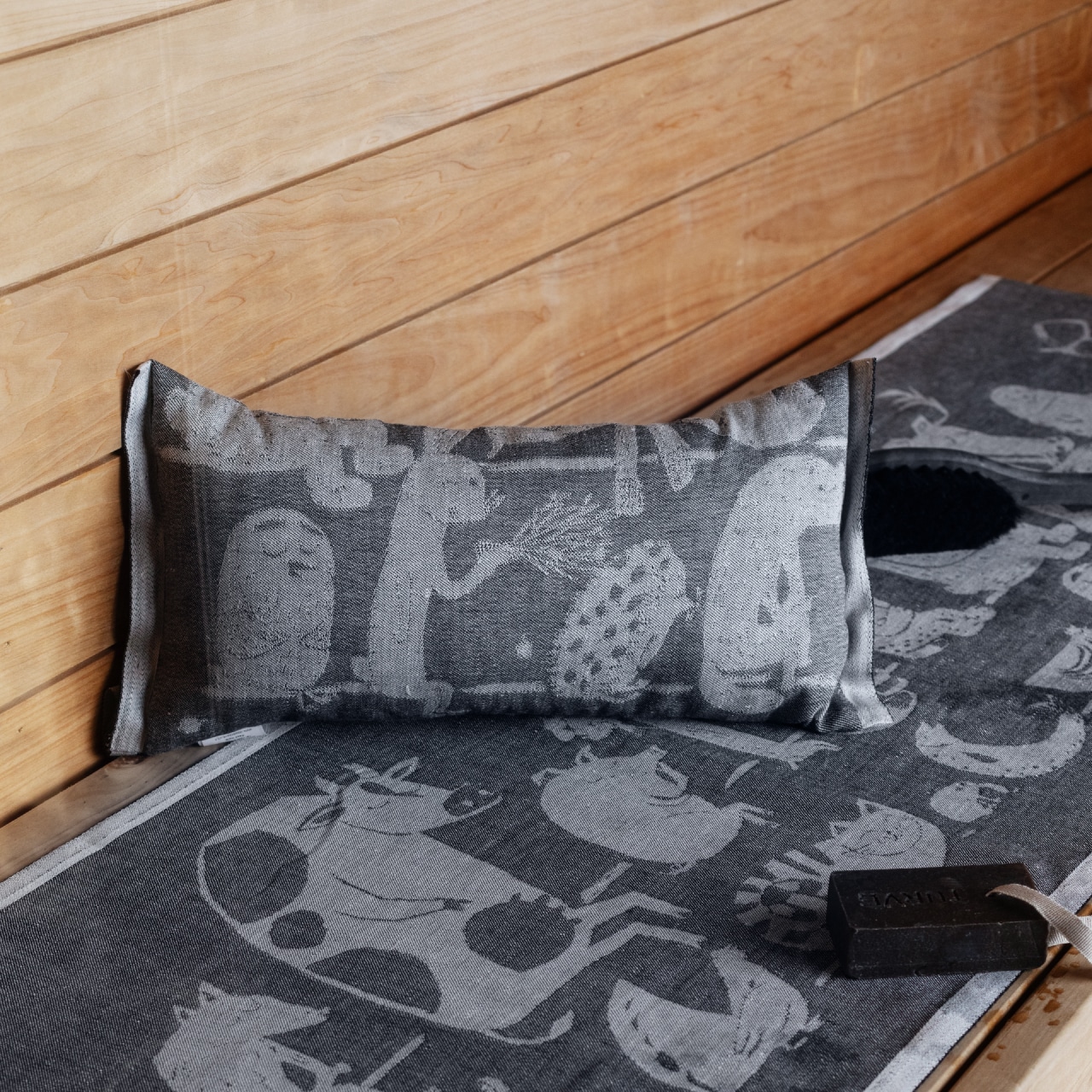 フィンランドで活躍するイラストレーター、マッティ・ピックヤムサによる、サウナで過ごす動物たちが描かれたサウナピロー。サウナでくつろぐ動物たちを、マッティならではのゆるく温かなタッチで描いたデザインが魅力です。