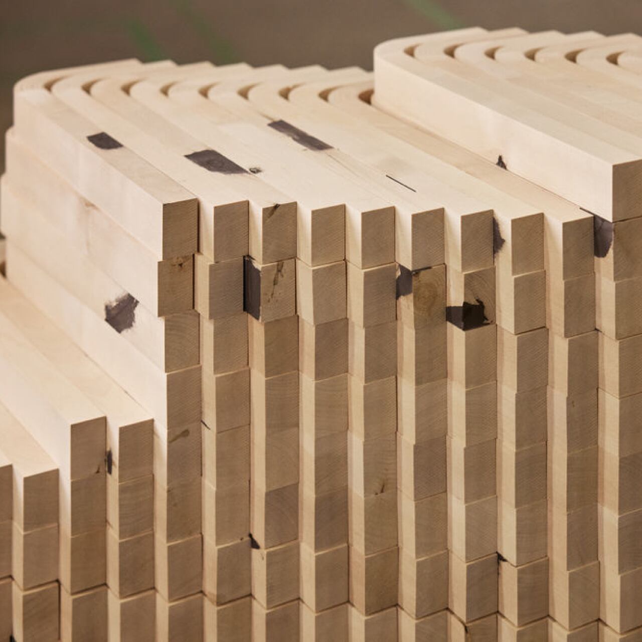 L-レッグの脚部と座面に、色の揺らぎ、節、虫の跡などのさまざまな自然の特徴を称えるワイルドバーチが使われています。ワイルドバーチ(=自然そのままの白樺)は、自然素材ならではの唯一無二の個性が表出した製品です。