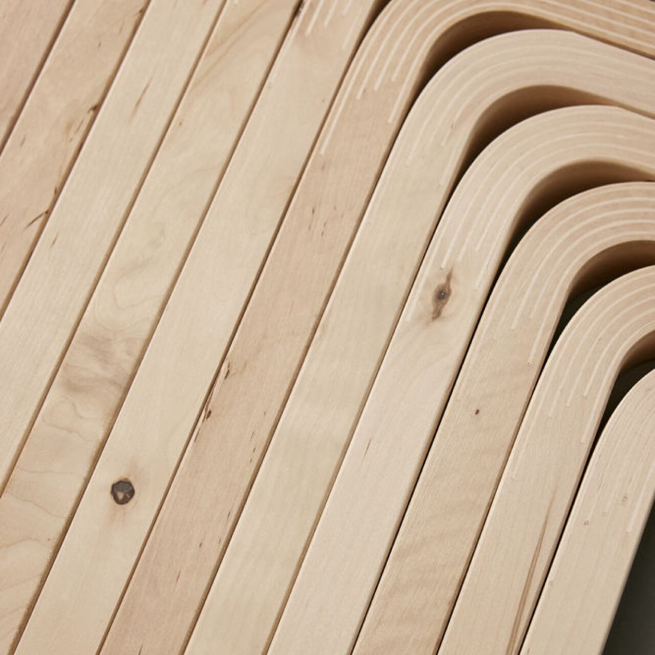 スリットタイプの座面は、軽量化と持ち運びのしやすさを追求した隙間が等間隔に配置されています。視覚的にも軽やかで、通気性と利便性を兼ね備えています。脚部は、アアルトが開発した独自の「L-レッグ」構造を採用。座面に直接取り付けることで、シンプルながらも高い強度と安定感を実現しています。余計な装飾を省いた、タイムレスな佇まい。空間に調和しながら、静かに存在感を放ちます。