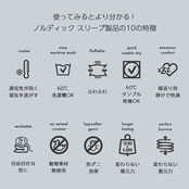 60度のお湯を使用し洗濯機で洗い、低温(60度)設定の乾燥機で乾燥させてください。乾燥後はすぐに製品を取り出しましょう。なお、NORDIC SLEEP製品には柔軟剤や酵素洗剤を使用しないでください。詰め物の特性が損なわれる恐れがあります。