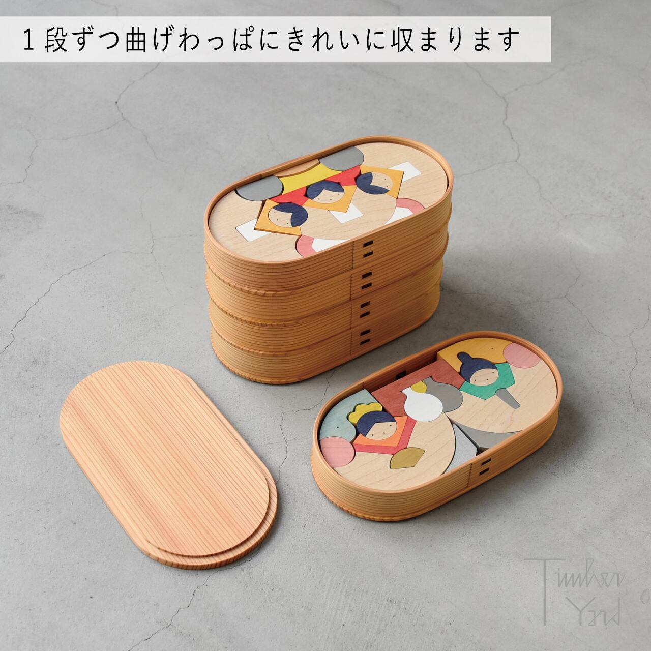 円を二つ接し、その上下を2本の水平線でつないで生まれるトラック型の曲げわっぱにお雛さまを収める段飾りです。人形の下部が半円状の銀杏の葉に似ているので、銀杏びなと名付けられました。