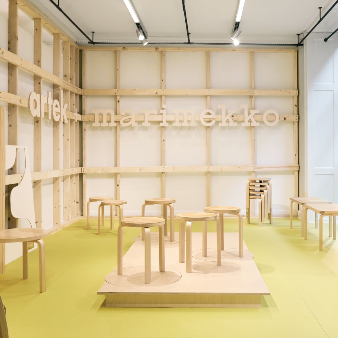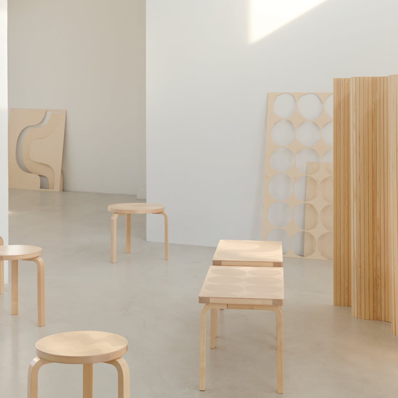 マリメッコのデザイナーであるマイヤ・イソラが手がけた象徴的なパターンとアルヴァ・アアルトがデザインしたスツール60がコラボレーション。今回の「Artek + Marimekko」シリーズには「アルキテフティ(建築的な)」プリントコレクションから、3つのパターンが選ばれました。