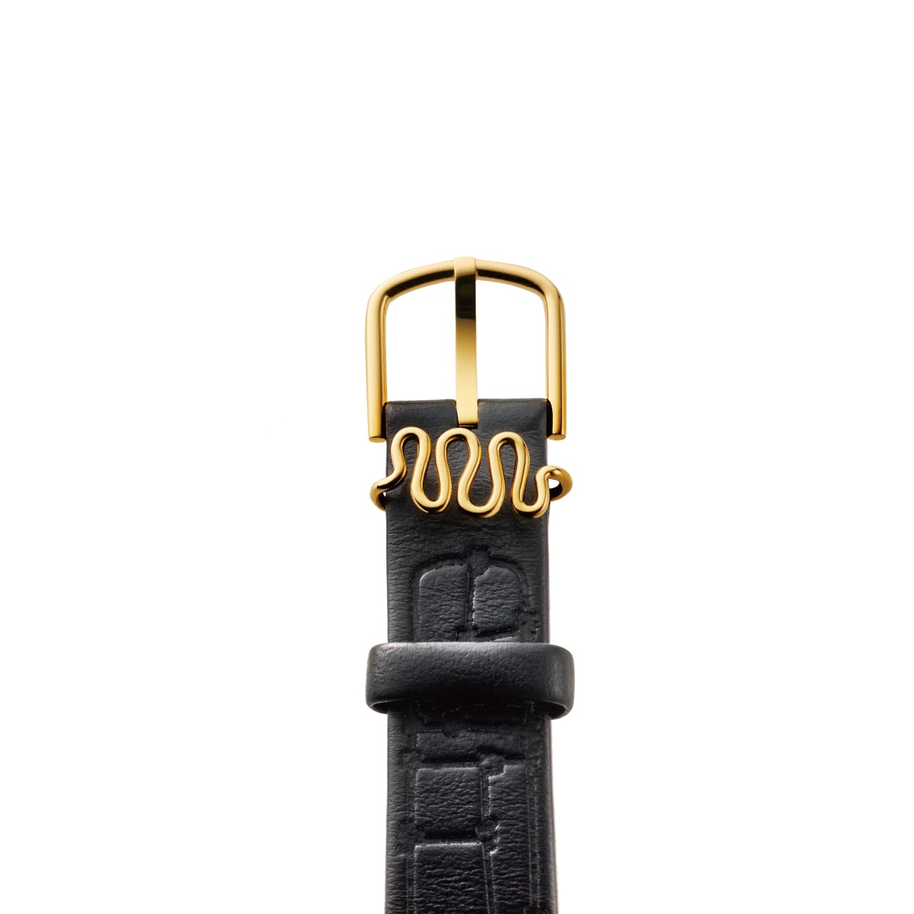 限定モデルは、「HAyU」の作品の特徴である黒とゴールドをベルトと文字盤に採用。「CITY HALL(シティーホール)」の文字盤は、ブランド展開の中で初のゴールドを使用します。黒のベルトにアクセントとなる「HAyU」を象徴するワイヤーアートのワイヤー特有の歪みと、繋ぎ部分の溜まり部分がベルトループでミニマムに表現されています。