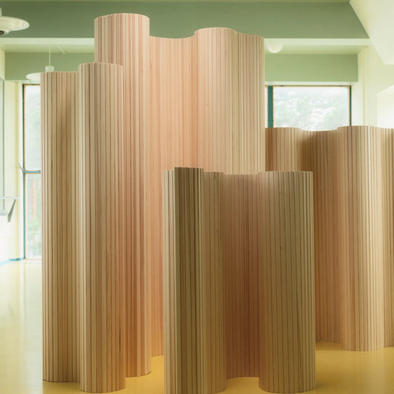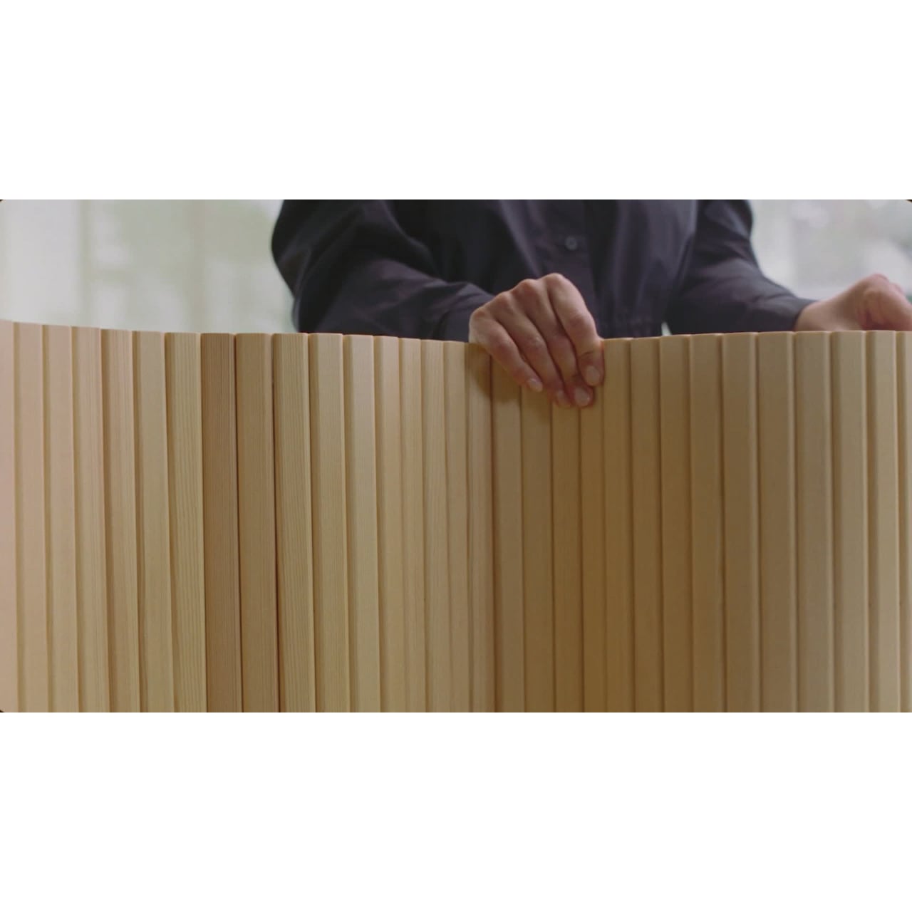 パーテーション 100は、パイン材を垂直に並べて繋ぎ合わせた、シンプルで美しい構造が特徴です。直線的に立てて間仕切りとして使うことはもちろん、巻いて収納したり、曲線を描くように配置したりと、空間に合わせて自在に形を変えられます。有機的でやわらかなフォルムは、誕生から時を経た今もなお愛され続けています。