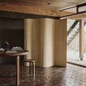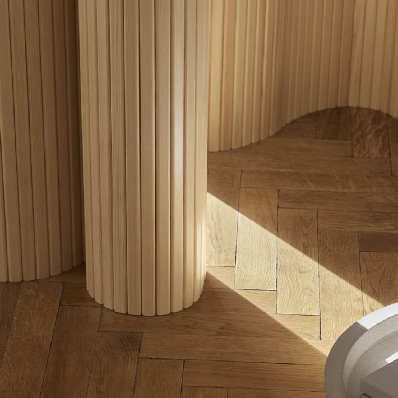 パーテーション 100は、パイン材を垂直に並べて繋ぎ合わせた、シンプルで美しい構造が特徴です。直線的に立てて間仕切りとして使うことはもちろん、巻いて収納したり、曲線を描くように配置したりと、空間に合わせて自在に形を変えられます。有機的でやわらかなフォルムは、誕生から時を経た今もなお愛され続けています。