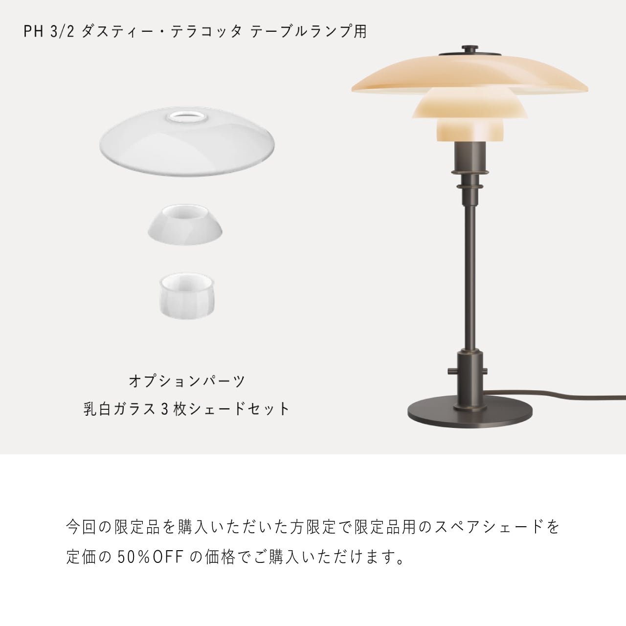 ※オプションの乳白ガラス3枚シェードセットは受注生産品のため、テーブルランプと入荷時期が異なります。予めご了承ください。