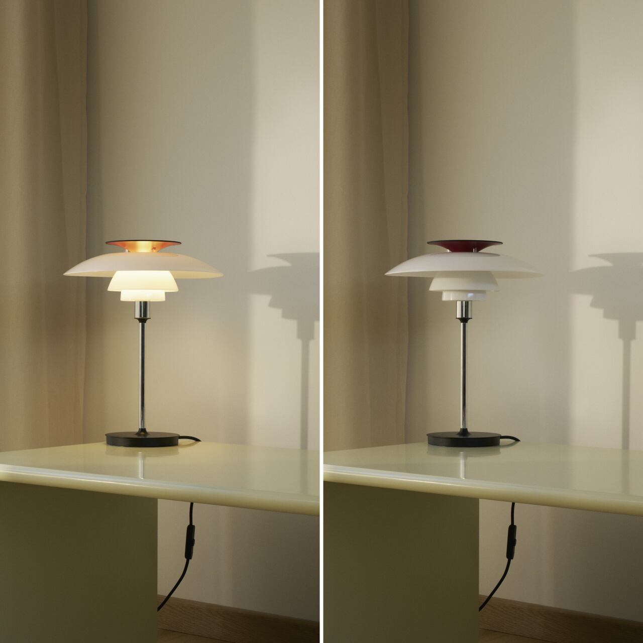 PH 80 テーブルランプは、拡散光と反射光を放ち、光の多くは下方に向けられます。乳白色のアクリルシェードは、快適なアンビエントライトを提供します。クロームメッキのタイプは、赤いトップ・リフレクターが光に暖かみを加えます。ホワイトタイプは、白いトップ・リフレクターがクリーンでエレガントな印象をもたらします。