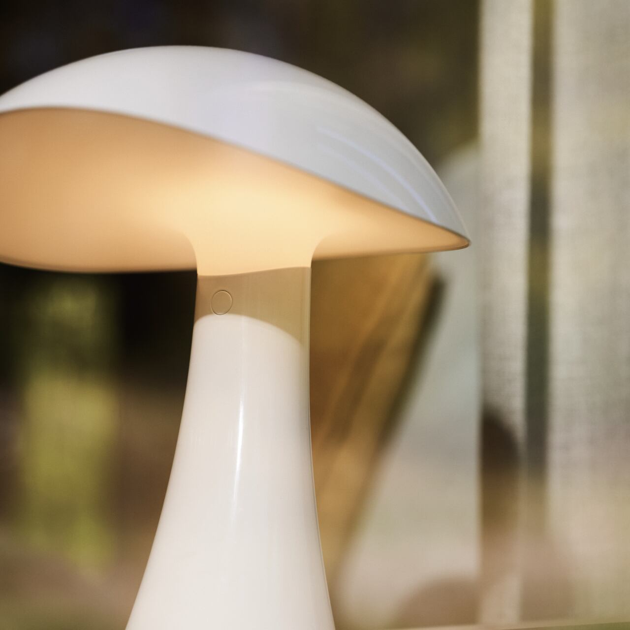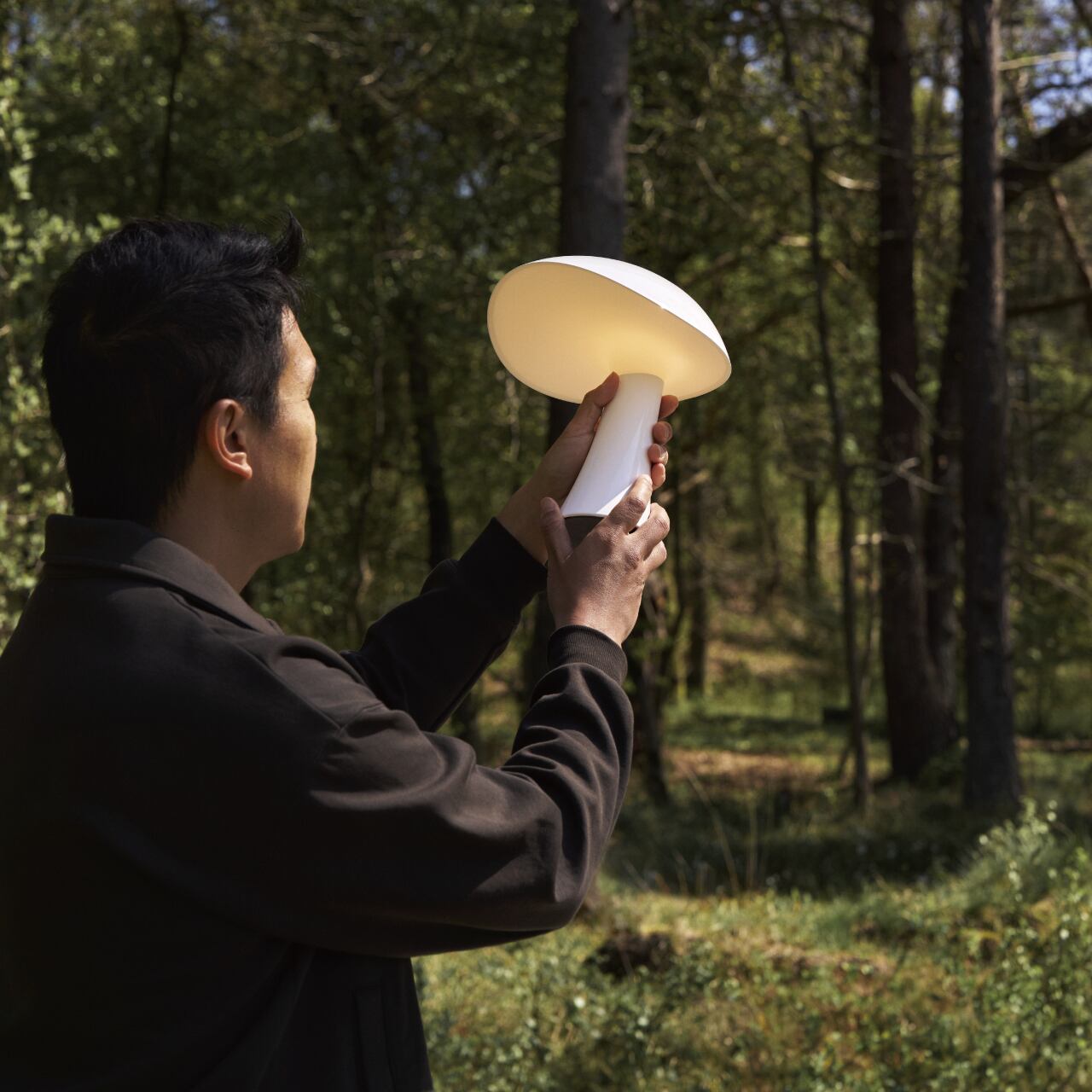 ガブリエル・タンは、大きな帽子のうねるような曲線からRumee ポータブルランプを着想しました。そのデザインは自然界の要素を想起させ、彫刻的です。近い位置から卓上を照らしますが、卓上面での反射光が間接照明となって周囲を柔らかく照らします。下面にはディフューザ―が装着され、グレアがなく、調光も可能です。Rumee ポータブルランプは見た目に美しいだけでなく、持ちやすく、場所から場所に手軽に持ち運ぶことができます。