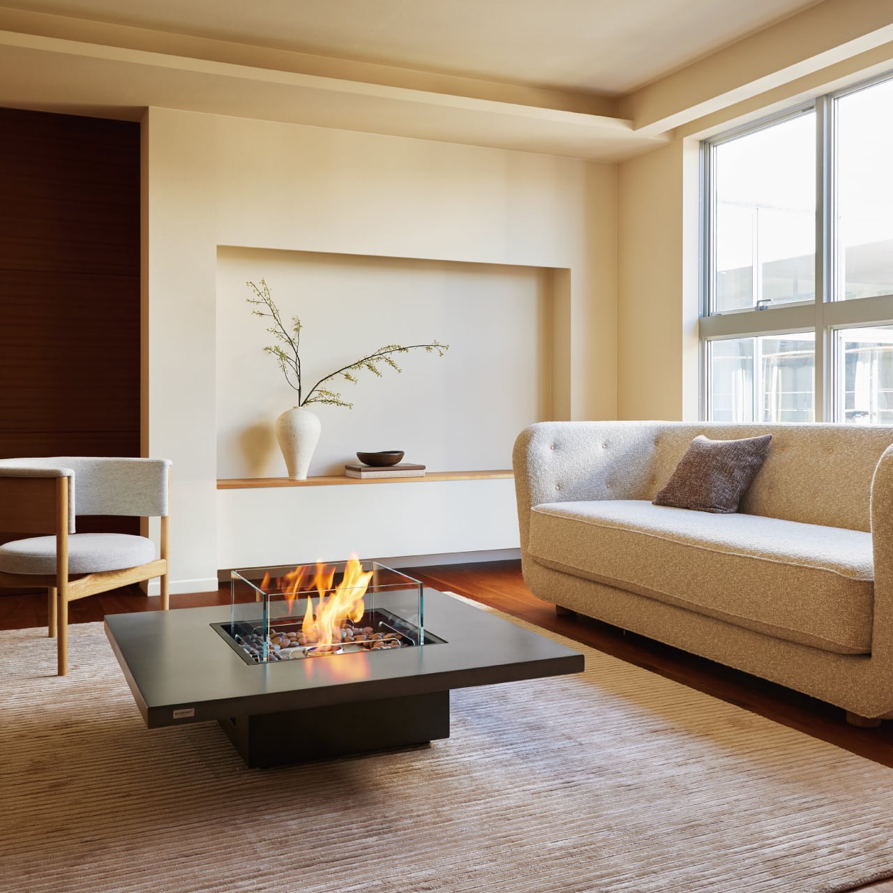 高さのある炎が魅力の開放型暖炉です。 ロータイプでスクエア型のフォルムは、食事やドリンクを置くのに十分な広さを確保しており、空間の美しさを引き立てながら、エンターテイメント性にも優れた一台です。広めのラウンジエリアに理想的な設計で、スクエア型のベースは複数のアームチェアをゆったりと囲む配置など、ライフスタイルやインテリアに合わせて、寛ぎ空間をカスタマイズいただけます。