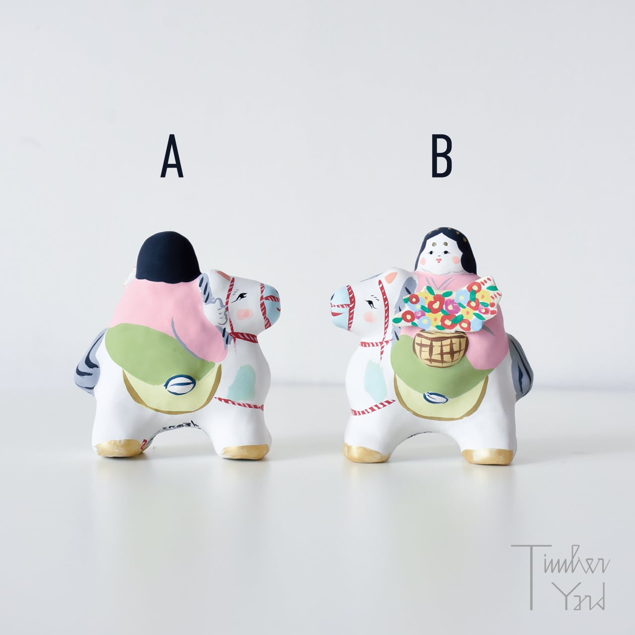 やさしいパステル調の色合いで絵付けが施された馬とお多福さんに、