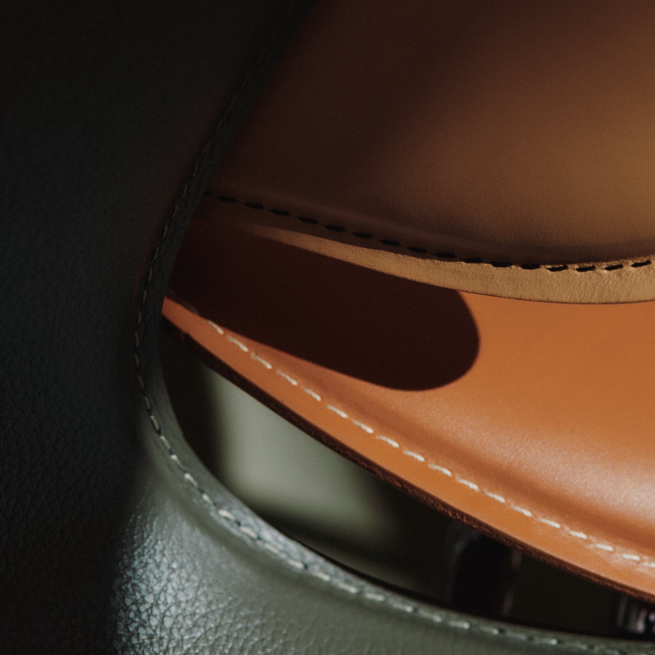 レザーのエッジには、コントラストの効いた糸でステッチが施されています。