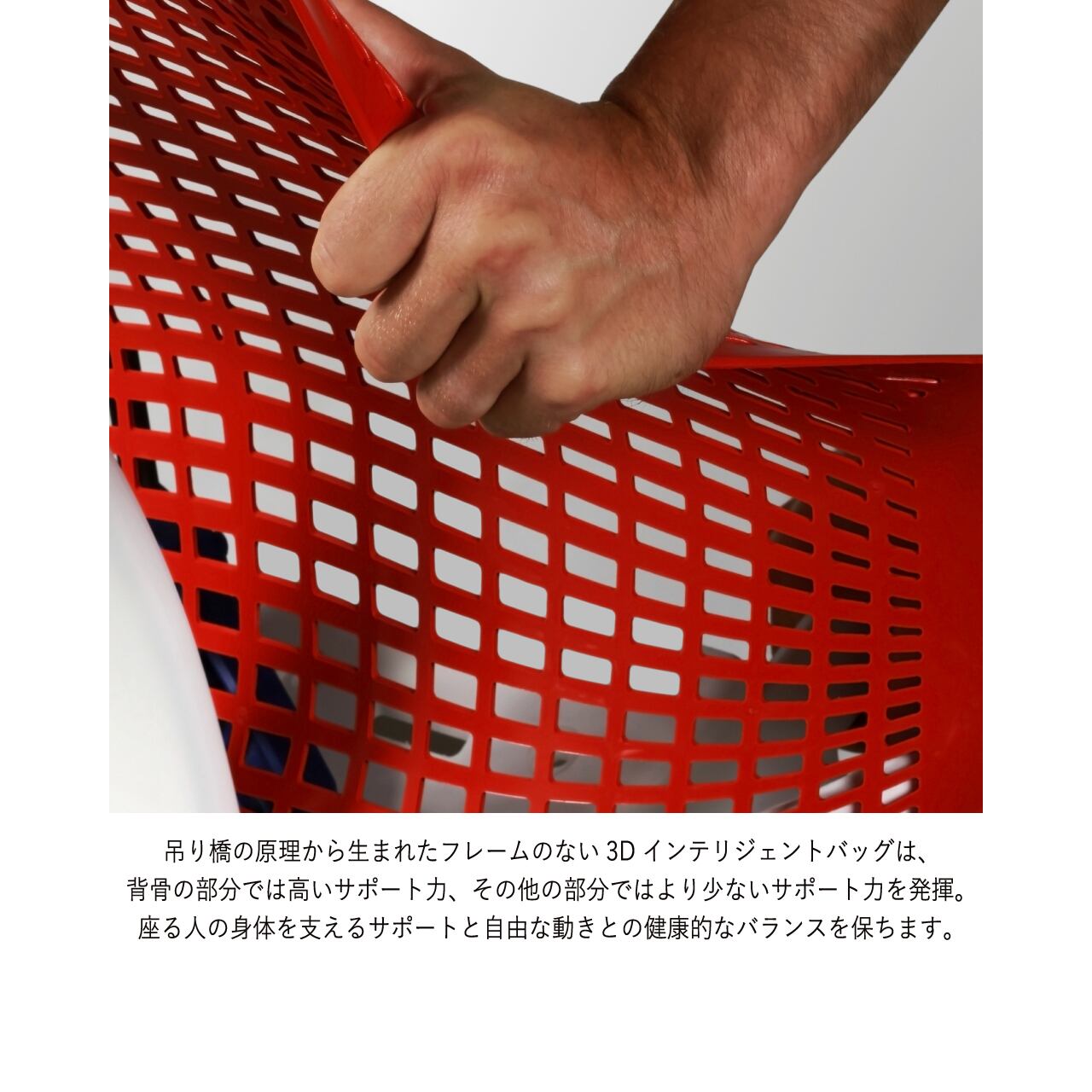 フレームのない3Dインテリジェントサスペンションバックは、エラストマー製ストランドを部位ごとに張力を変えて配置。必要な部分には確かなサポートを、動きたい部分には自由を与え、快適さとしなやかさを両立します。さらに、仙骨を支える形状により背骨が自然なS字を保ち、疲れにくく健康的な姿勢をサポート。通気性にも優れているため、一日中さらりと快適に過ごせます。
