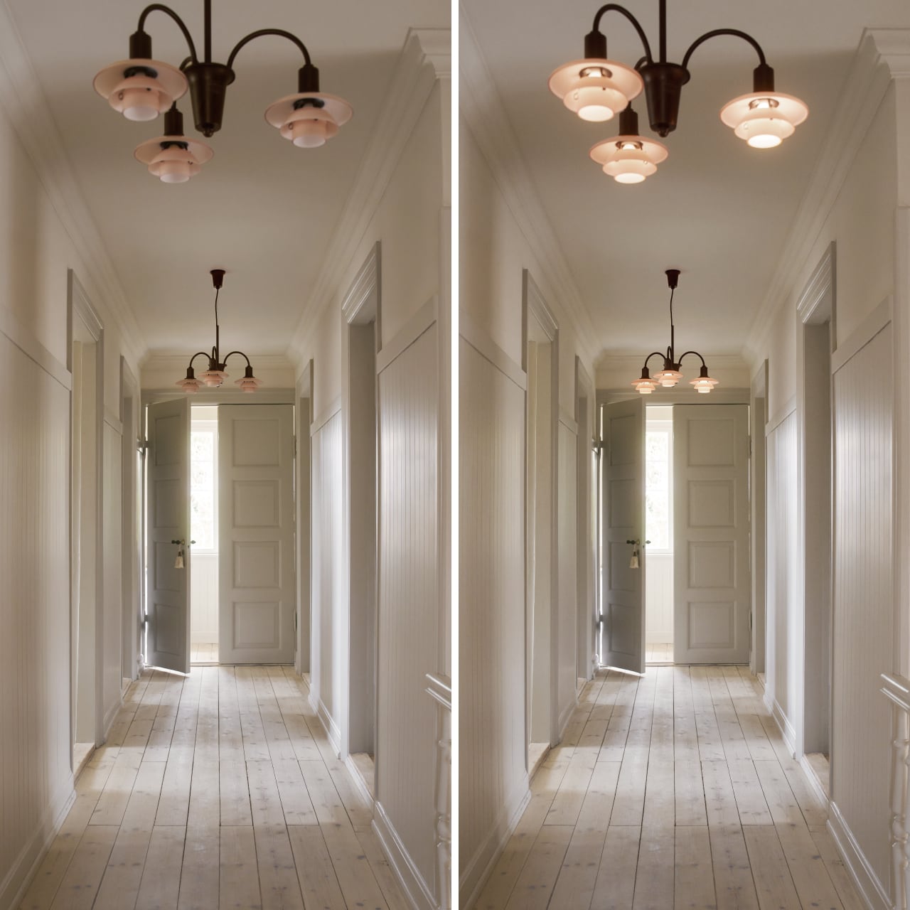 シェードはPHランプの中でも一番小さいサイズとなる「1/1」のタイプです。クリアガラス、ダスティー・テラコッタ色、ホワイトガラス、内側をサンドブラスト加工したクリアガラスのハンドメイド4層吹きガラスで優しくふわっと明かりが灯ります。