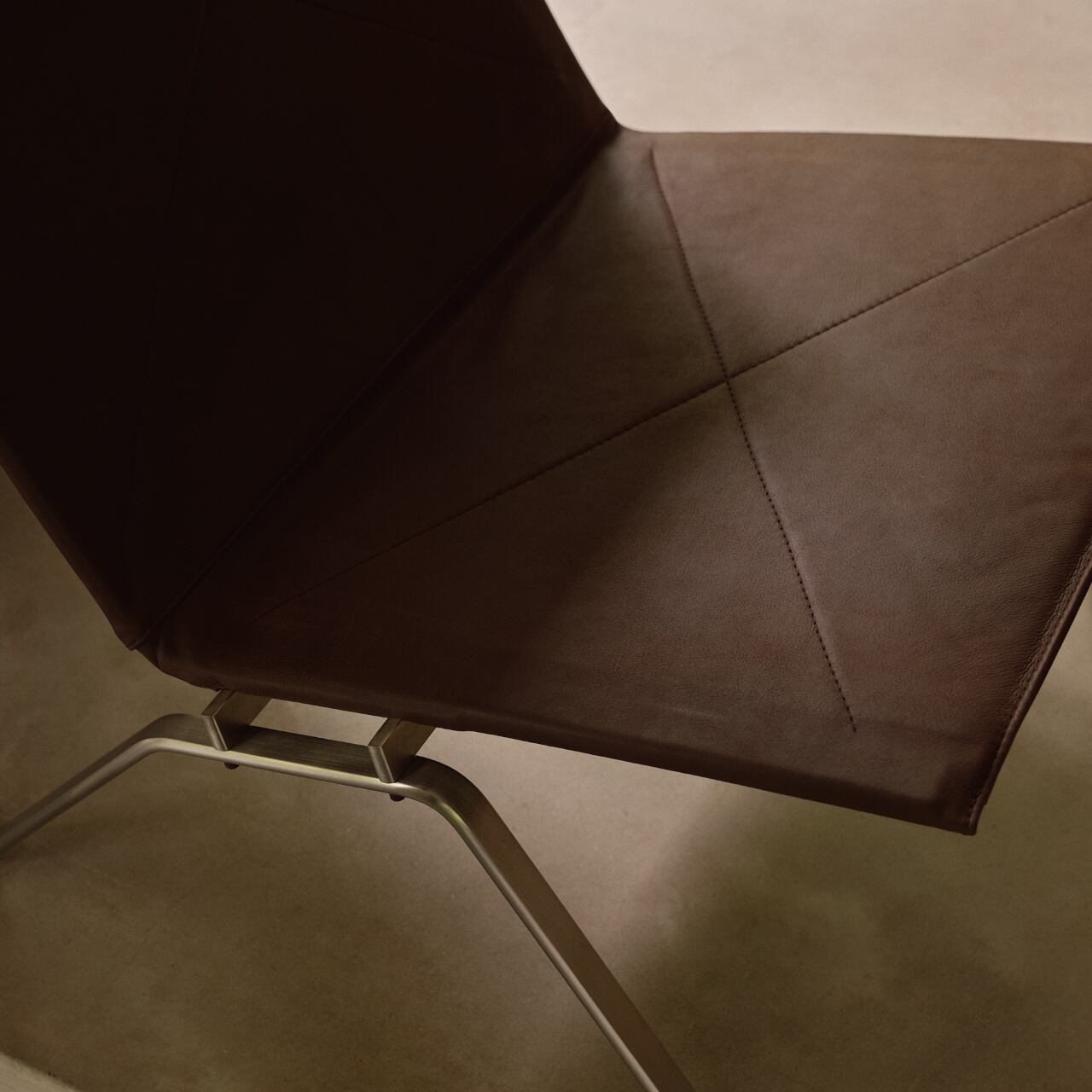 1枚のシートとスチールフレームに固定されたバックピースで構成されるラウンジチェア。シートとバックピースにはヘイズレザーを使用。フレームにはサテン仕上げを施したステンレススチールスプリングを使用しています。