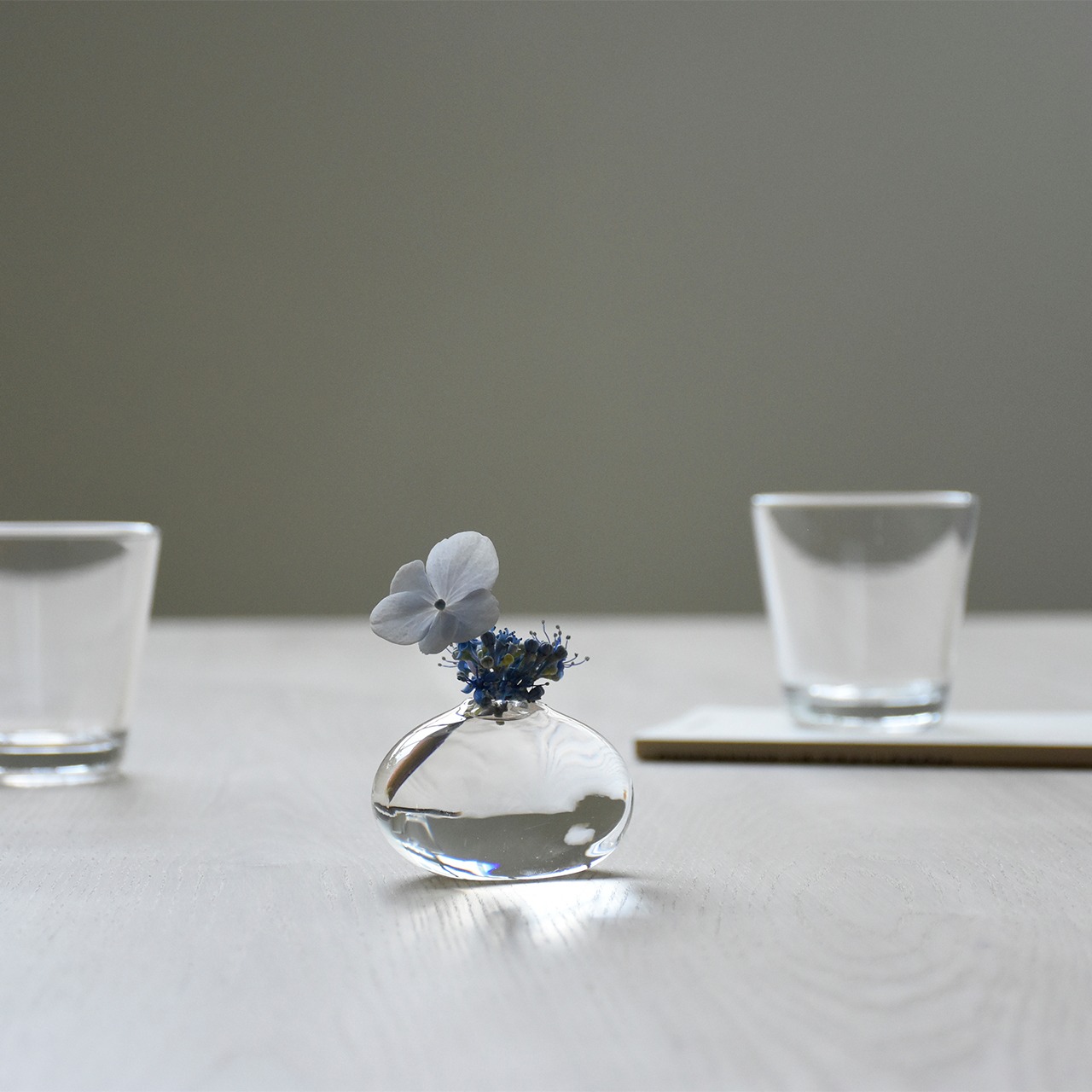 小さなガラスのフラワーベースは、まるでお水をおいてるかのよう。その美しさと可愛さにはうっとり…。反射も綺麗で、透明感のある洗練された空間にしてくれます。