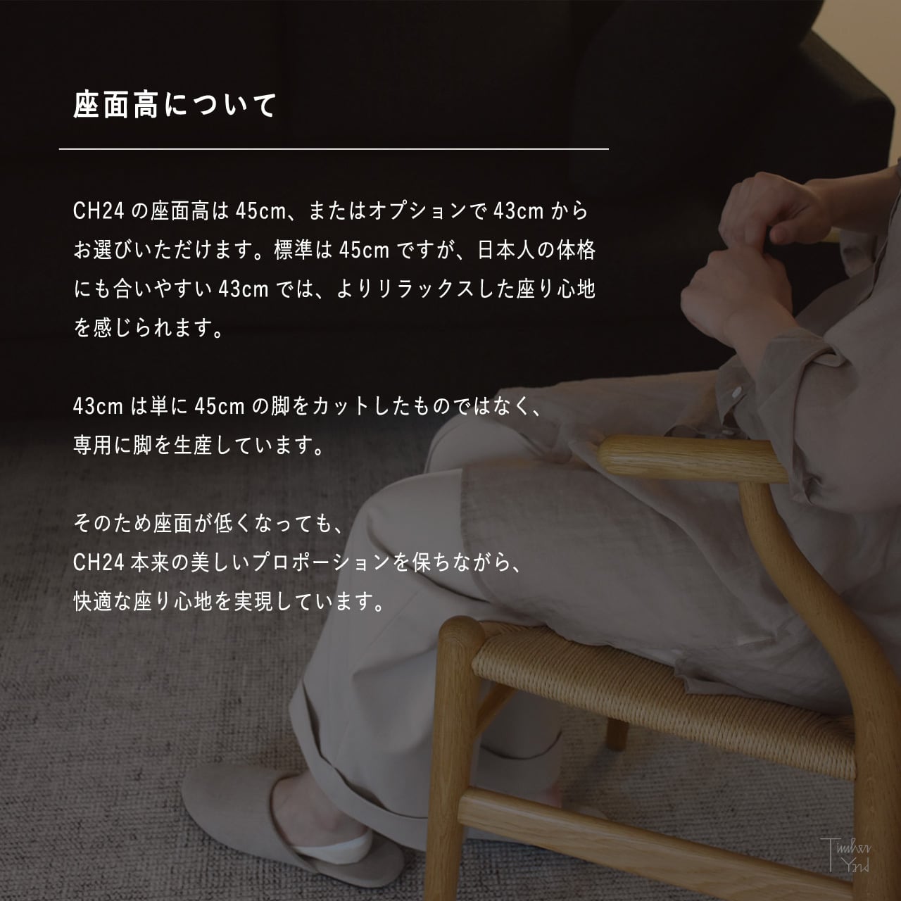 座った時の安定性と心地よい使用感。背もたれは、背中の気持ちの良いところに当たり、座面のペーパーコードは身体をじんわりと受け止めます。またペーパーコードが使うたびにその人の体になじみ、よりしっくりとくる座り心地に変化していきます。日本において、ダイニングチェアとして多くの人に親しまれているYチェア。実はゆったりとくつろげる”ラウンジチェア”としてデザインされています。ひとたび手に入れれば、使用の幅は広く、空間のアイコンとしてもお愉しみいただけます。