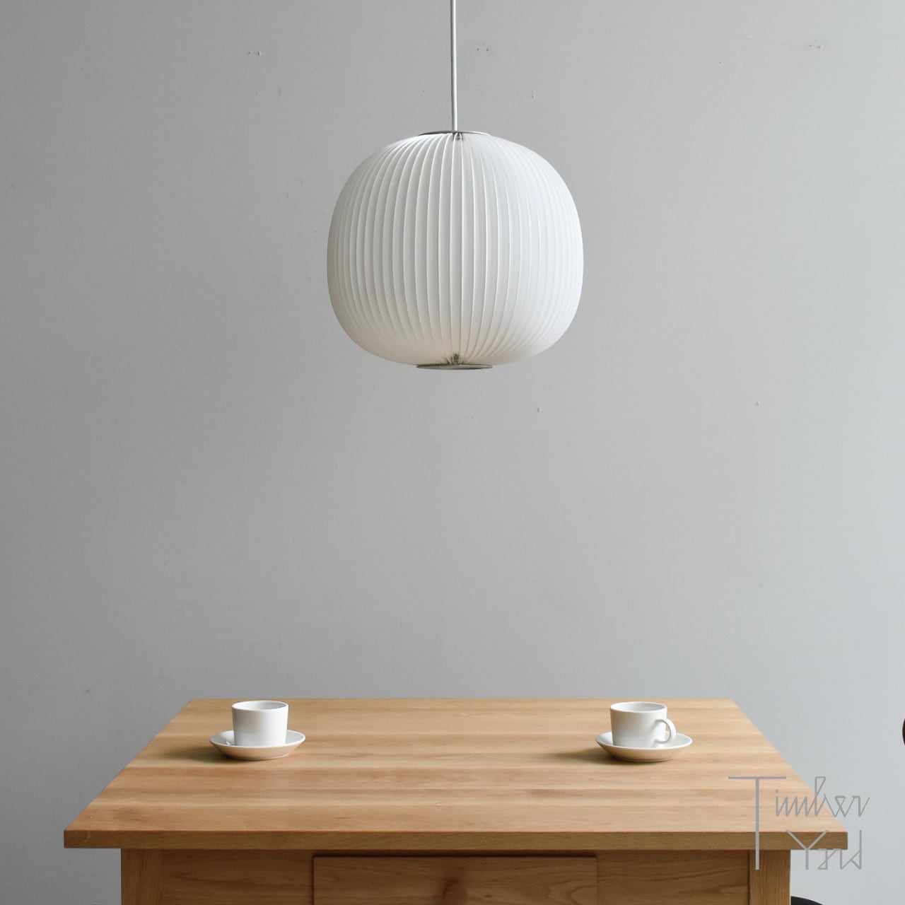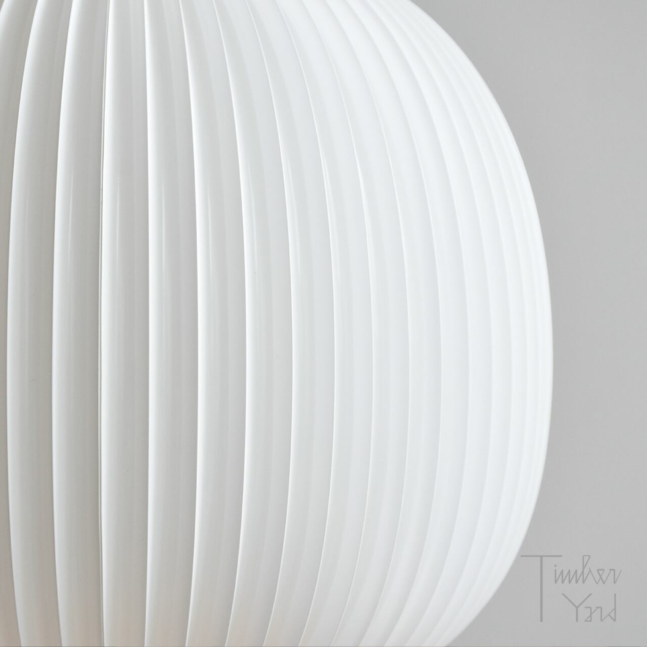 1枚の樹脂製シートから無数のプリーツを折り上げ、頂点を作らずに熱で湾曲させる技術は習得が非常に難しいとされています。角のない流れる様な有機的なフォルムにより、シンプルで美しく、そして軽やかな印象の照明に仕上がりました。