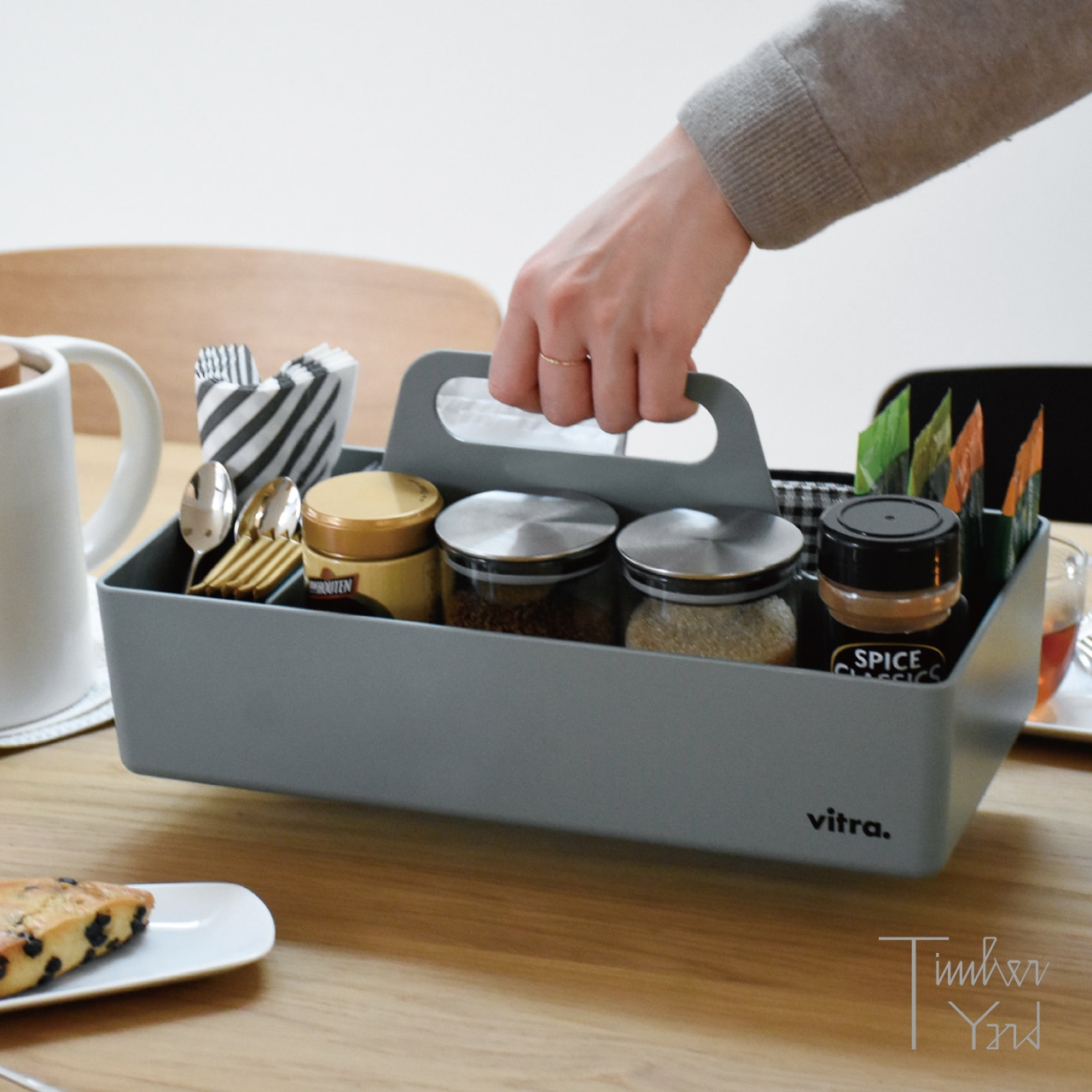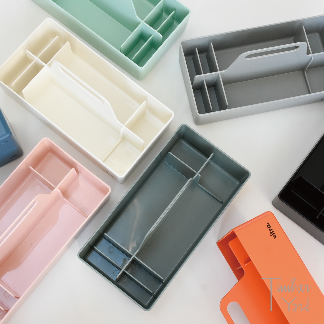 2010年にアリック・レヴィがデザインしてから、デザイナーズアイテムとして人気を博しているヴィトラのツールボックスは、その名の通りツールボックスとして便利に使うことができます。内側は7つのスペースに分かれており、長いものや細かいものを一緒に仕分けて収納できます。仕切りは固定されているため動かせませんが、モノのサイズ感は意外とわかりきったものが多いからか不思議と使い勝手が良いです。文房具、玩具、リモコン、ゲーム、ガーデニンググッズ、工具、ハンカチなどの布製品、ちょっとした小物など、ツールボックスがあれば片付けや収納も愉しく生活が便利になります。