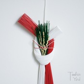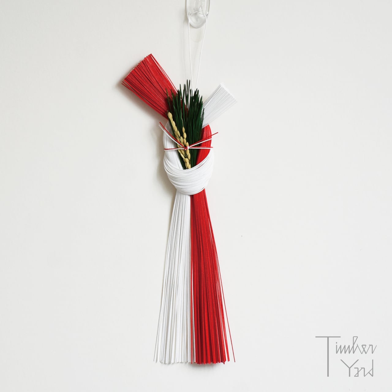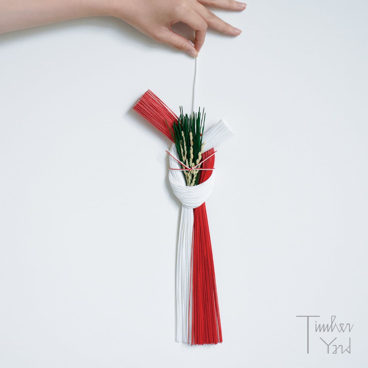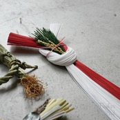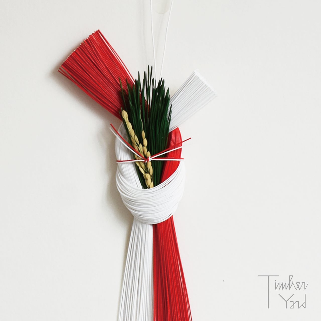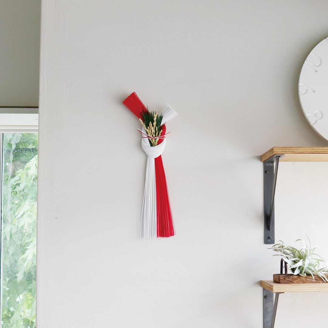 常緑樹である松は、年神様が宿る「依代」とされ、いつも青々しいことから長寿の象徴とされます。稲穂は一粒が万倍にもなることから豊かさを願い、穢れをはらい清める赤白の水引で力強く結んだ縁起の良い飾りです。