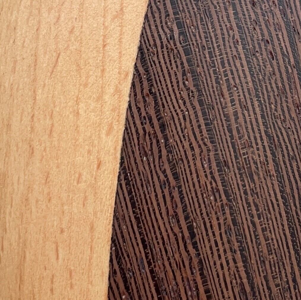 シルクのように滑らかなブナ材(お腹)と独特のニュアンスのあるウェンジ材(頭から背中)を組み合わせて手作りしています。異なる木材を組み合わせるために、これまでにあったブナ材にペイントを施したタイプよりも糊付けや湿気の調整などの手間がかかりますが、より木目を楽しむことのできる高級感のある仕上がりになりました。