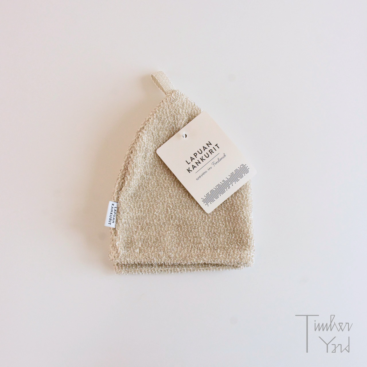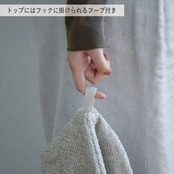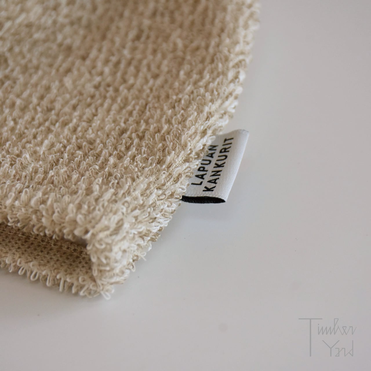 天然の混合素材で織られた生地は、氷点下になる冬のフィンランドでのサウナ使用も想定しているので、とても丈夫。洗濯も可能で洗うほどやわらかく馴染んできます。アクセントにもなっているリボンの輪は、乾かす際に便利です。
