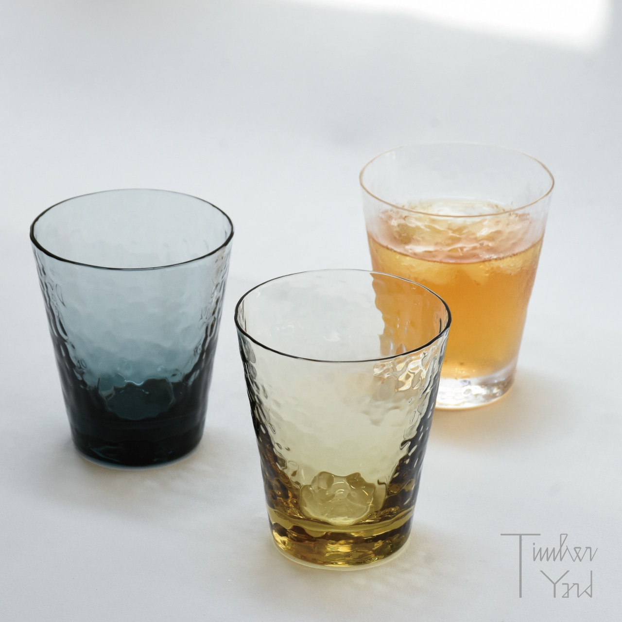 高温で溶けたガラスを急冷すると、ガラスがきゅっと縮みます。ディンプルは、その特性を活かした味わいのあるシリーズです。中に入れたドリンクをみずみずしく演出します。