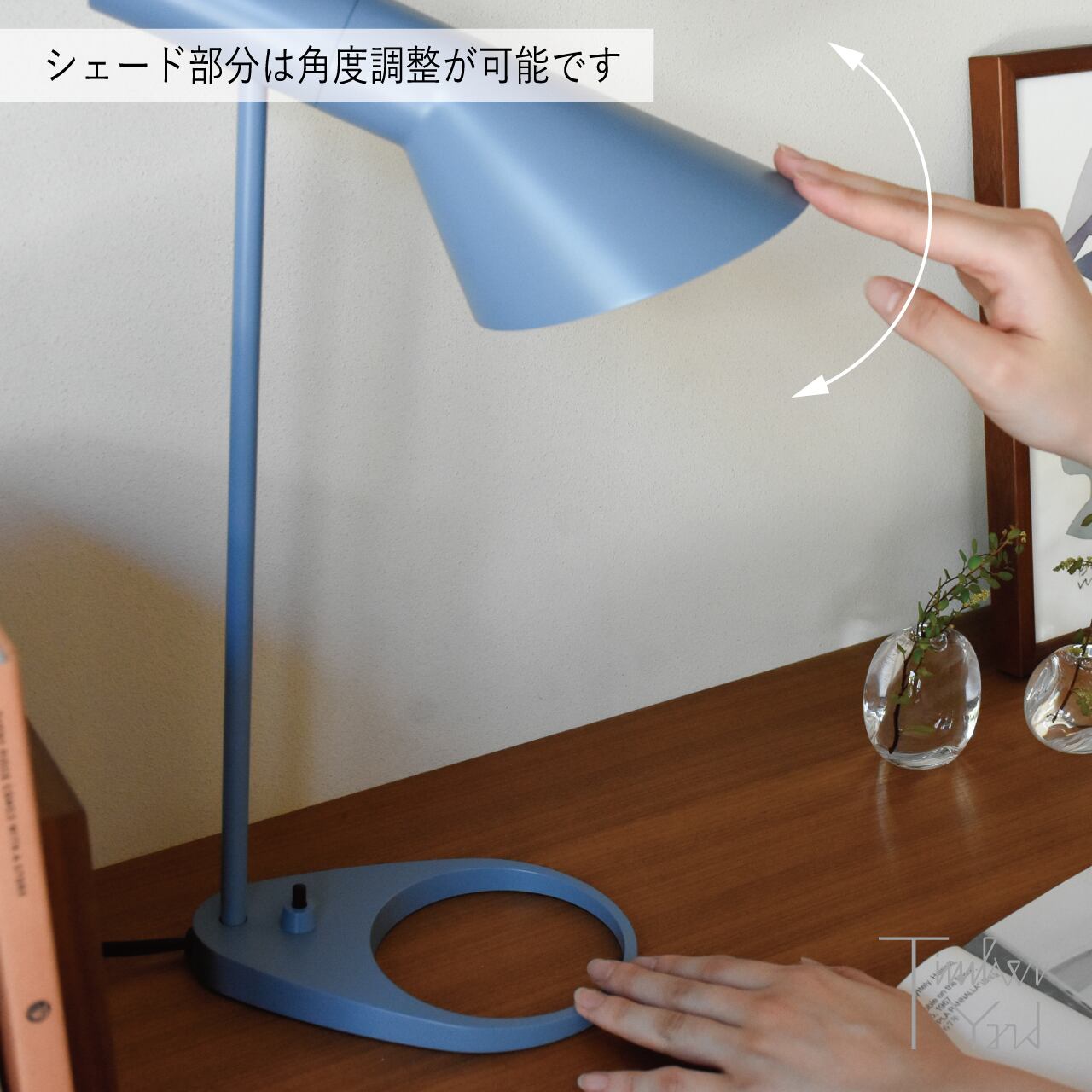 下方に向かって、明るい光を放ちます。柔らかい反射光を生むため、シェードの内側は白色塗装されています。角度が調節できるためデスク用のランプとしてはもちろん、室内の補助照明やディスプレイ照明としても使うことができます。