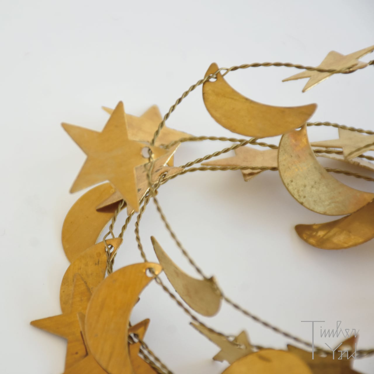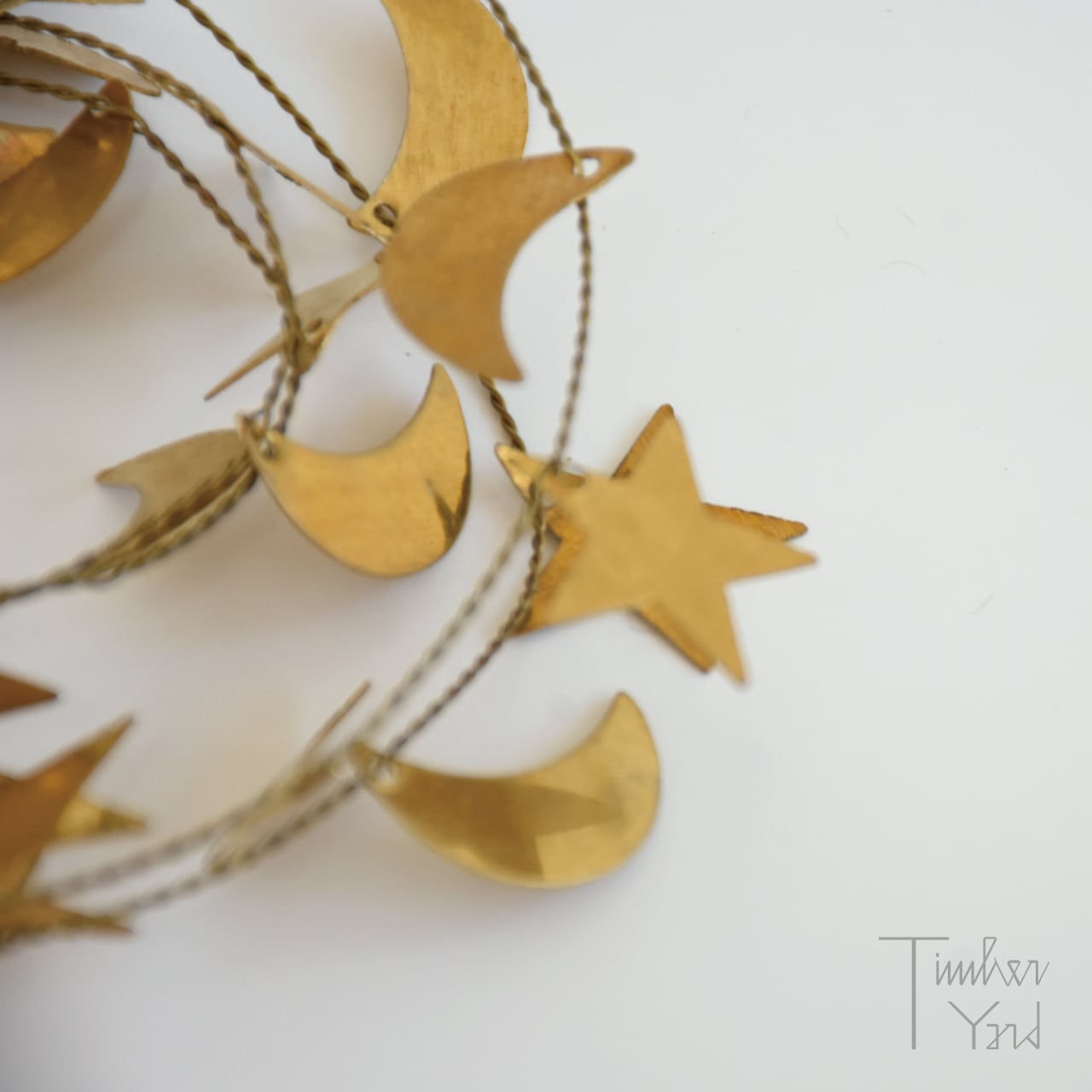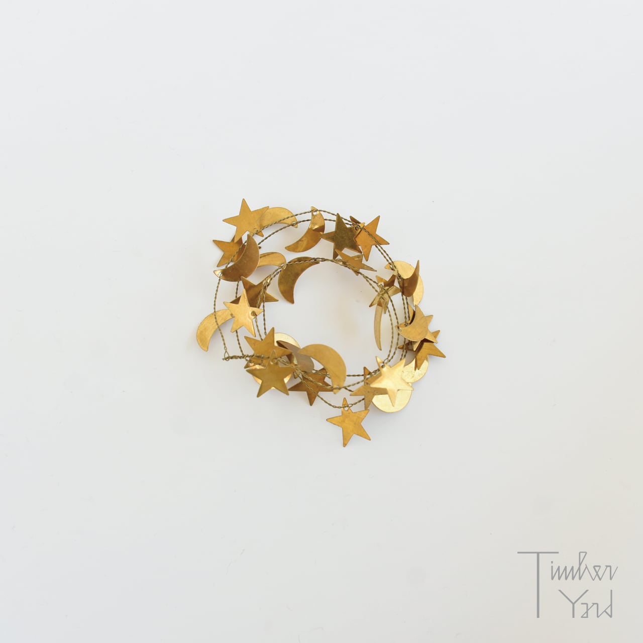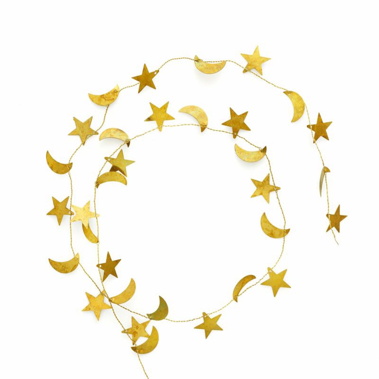 真鍮の細いワイヤーに、星や月のモチーフがたくさんついたガーランド。ワイヤーをくるっと丸めてリースにしたり、小さめのクリスマスツリーに巻きつけたり、伸ばして壁や窓にとめることもできます。