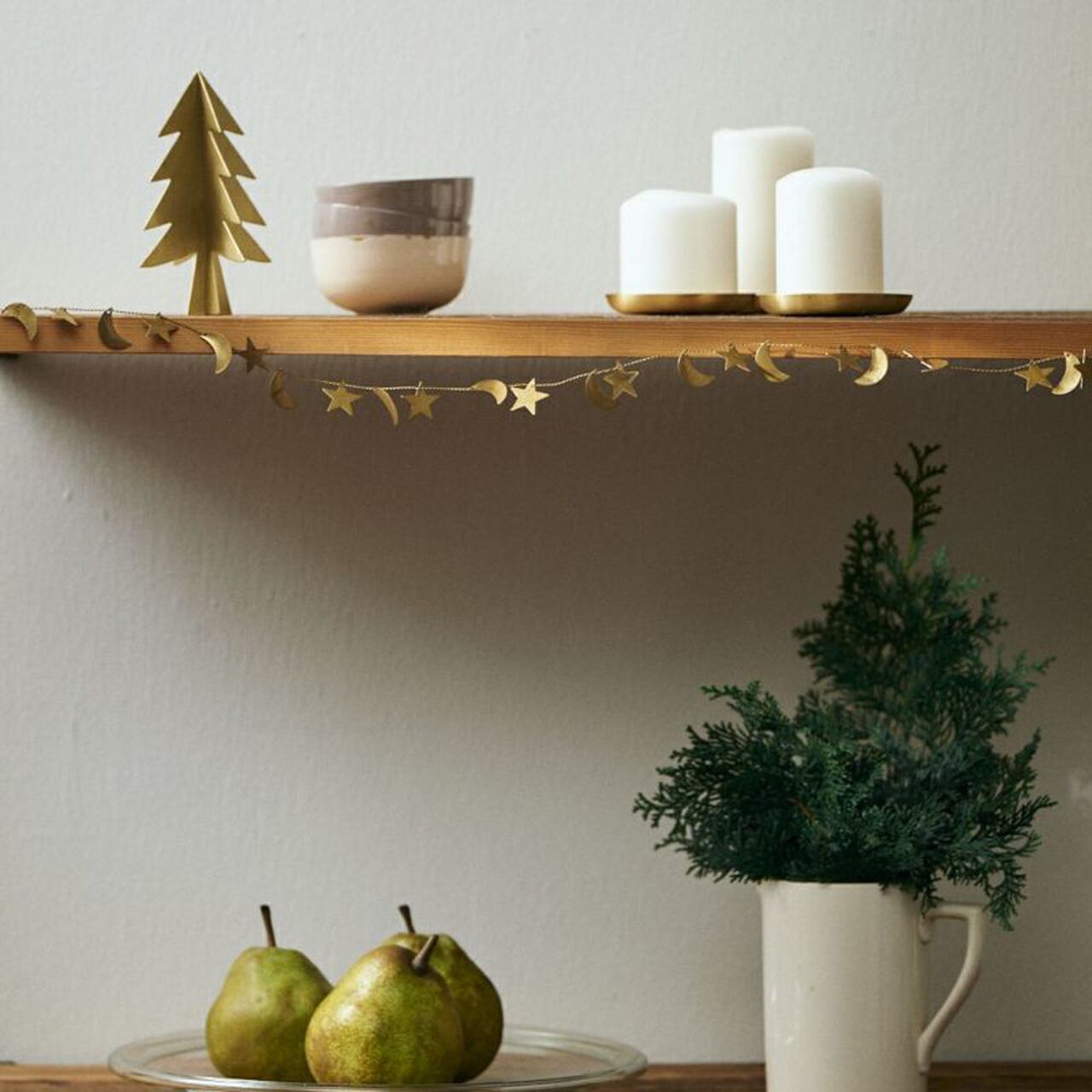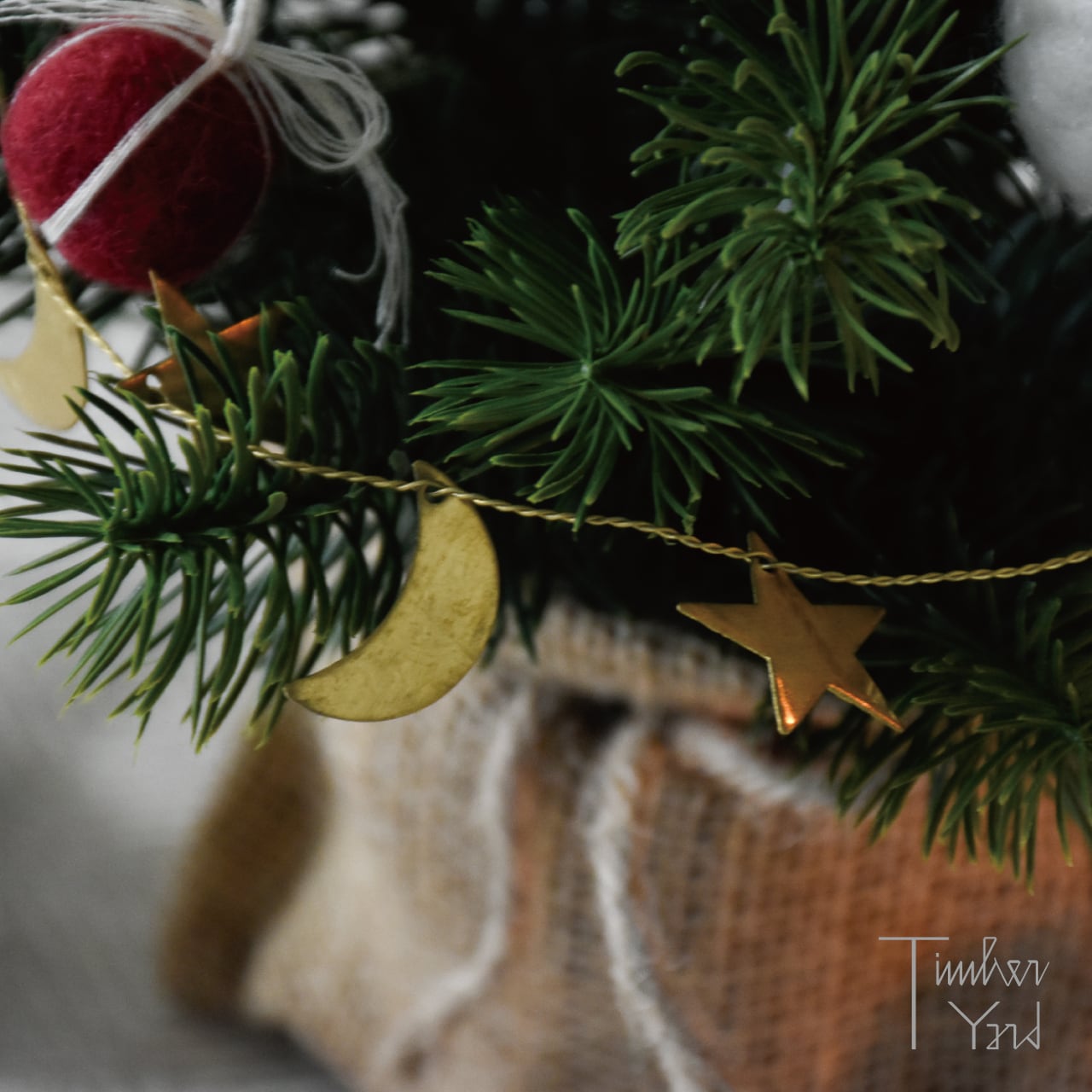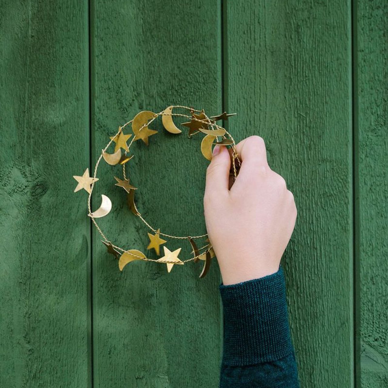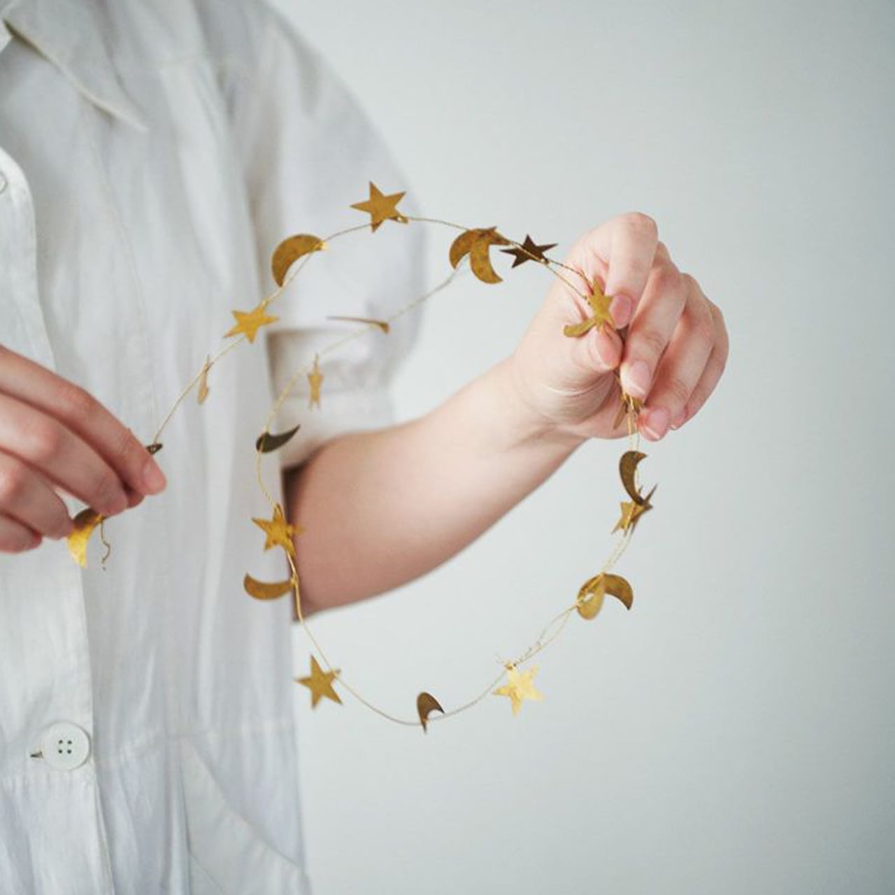 真鍮の細いワイヤーに、星や月のモチーフがたくさんついたガーランド。ワイヤーをくるっと丸めてリースにしたり、小さめのクリスマスツリーに巻きつけたり、伸ばして壁や窓にとめることもできます。