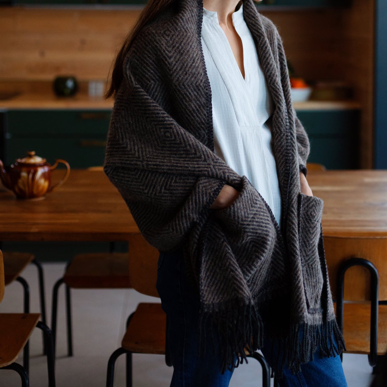 【ONLINE限定】MARIA ポケットショール / brown-black / 60x180cm+fringes / ポケット付き / ウール / マリア ポケットショール / LAPUAN KANKURIT(ラプアン カンクリ) | TIMBER YARD(ティンバーヤード)|北欧家具・北欧インテリアの通販サイト