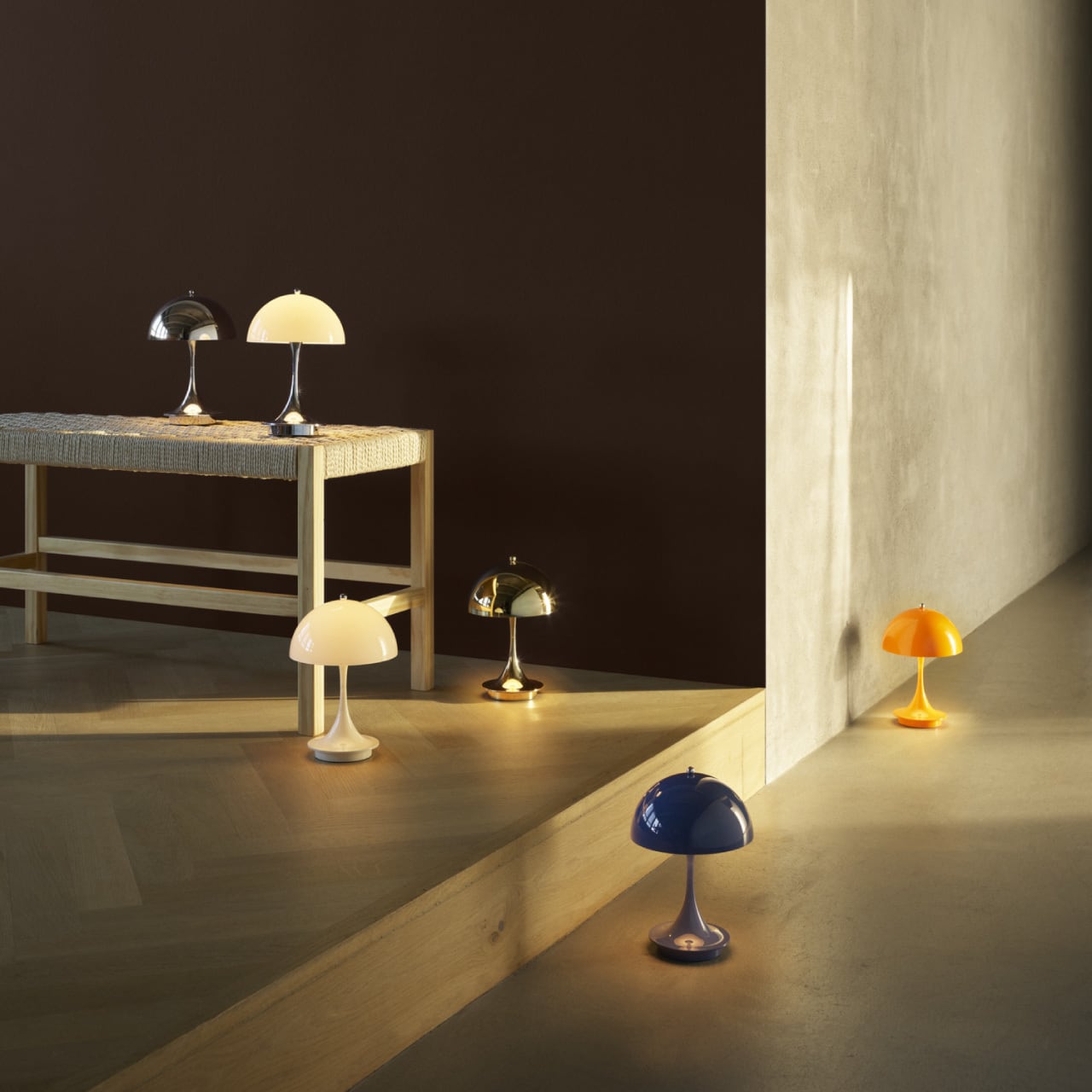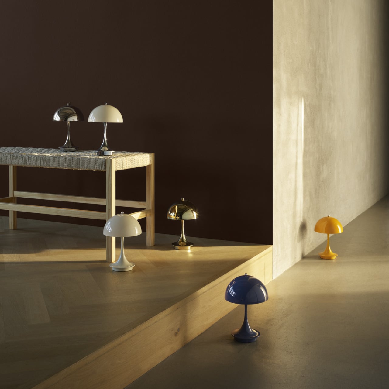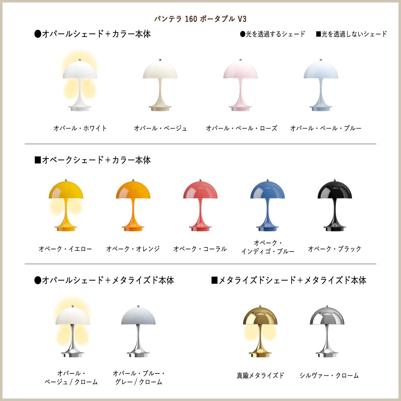 パンテラ 160 ポータブルには3タイプのシェードがあります。❶オパール、❷オペーク、❸メタライズドの3タイプです。❶のシェードは光を透過し、その拡散光とステム部分の反射光によって、優しい雰囲気を作りだします。❷と❸のシェードは光を透過させずに下方を照らし、ステム部分が反射するイルミネーションと合わさって、より落ち着きのある雰囲気を作ります。