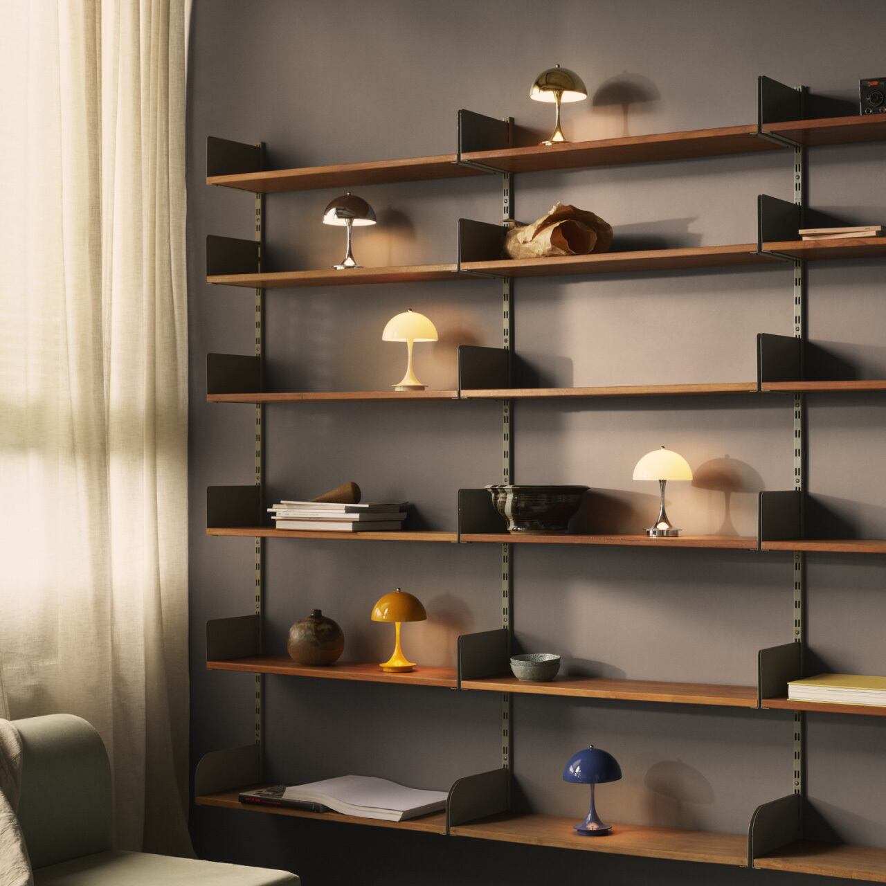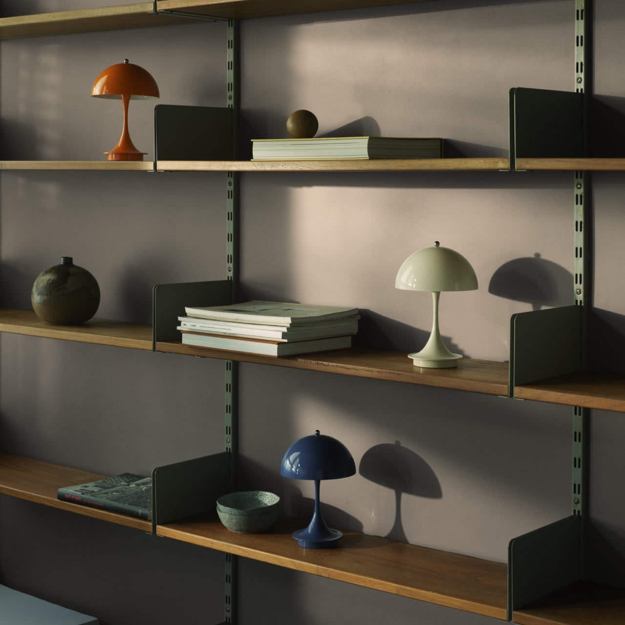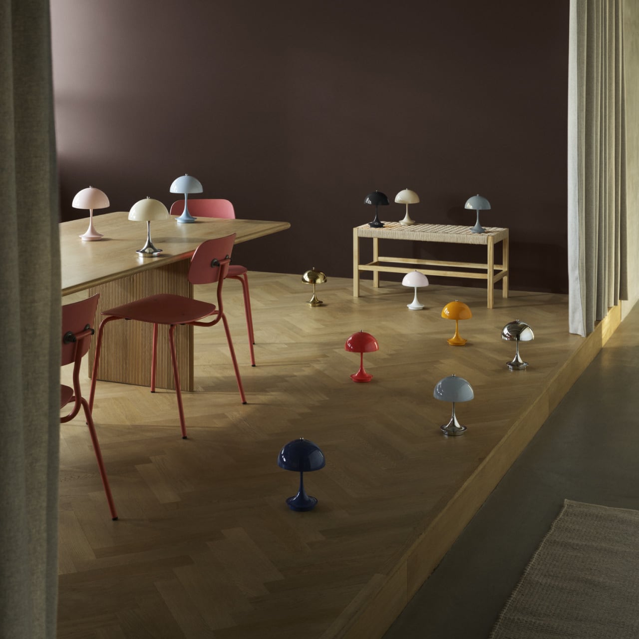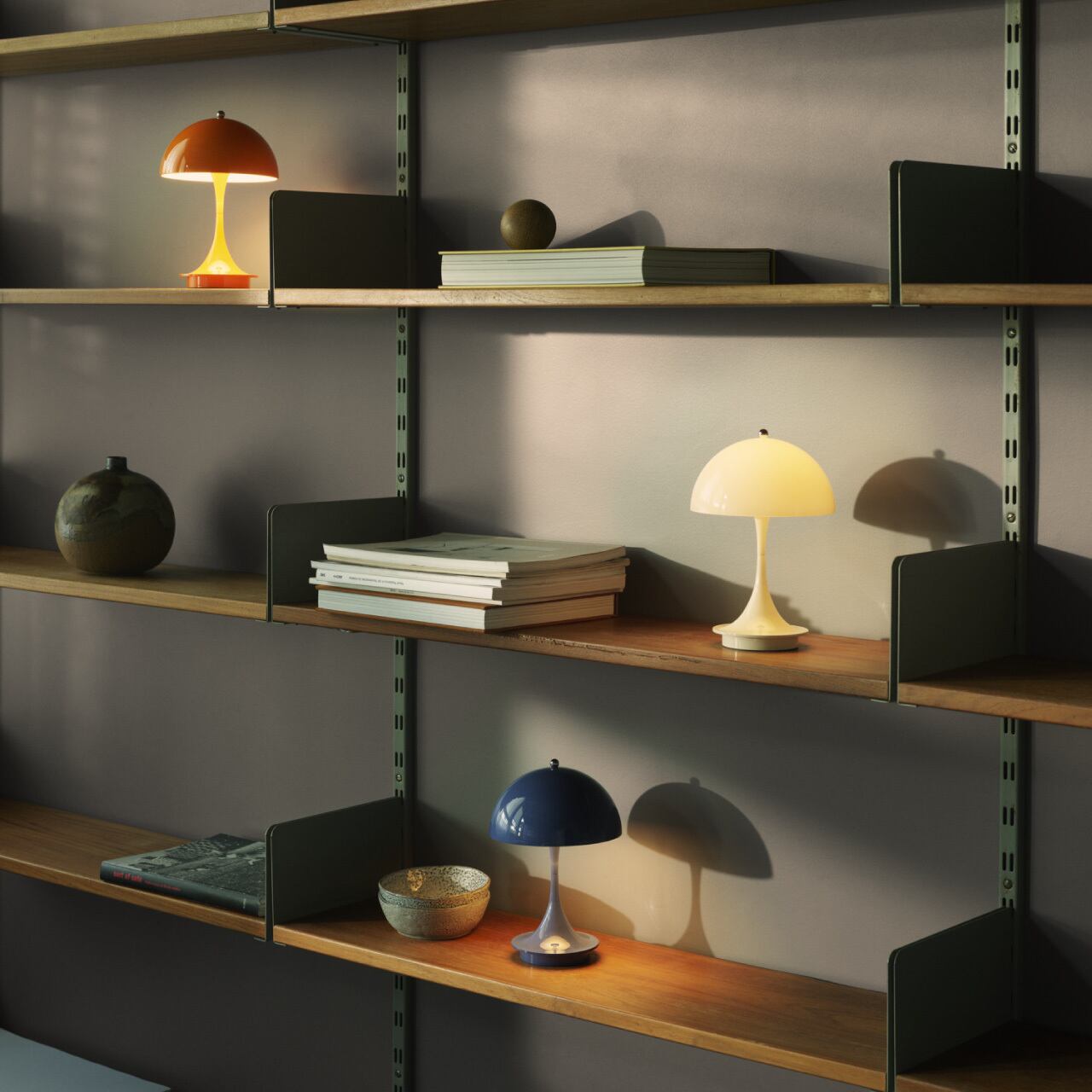 パンテラ 160 ポータブル(1971年)は、デンマーク人デザイナーのヴァーナー・パントンのクラシックなデザインを持ち運びできるように小型化したもので、シェードの直径はわずか160mm。このテーブルランプの有機的な形状は美しいだけでなく機能的でもあり、半球形のシェードが光を下方に向け、トランペット型のステム部分はその光を周囲へ反射し優しく繊細な雰囲気を作りだします。