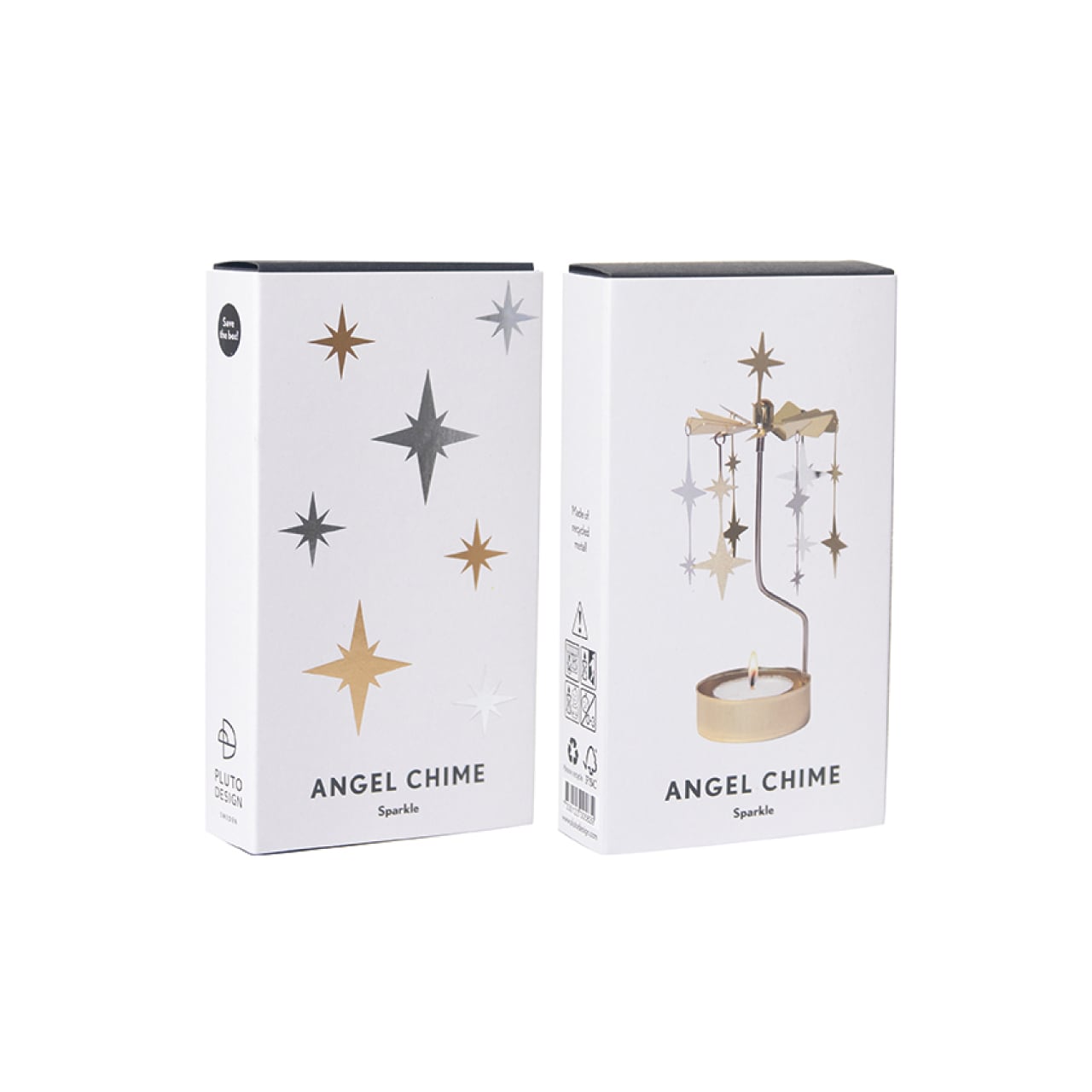 メタル素材で作られたロータリーキャンドルは、ろうそくの火が反射して自然ときらきらと輝きながら回ります。その輝きがテーブルや壁にも広がって、より特別な雰囲気に。羽についたクリスマスモチーフのモビールも揺れながらとても楽しそうです。