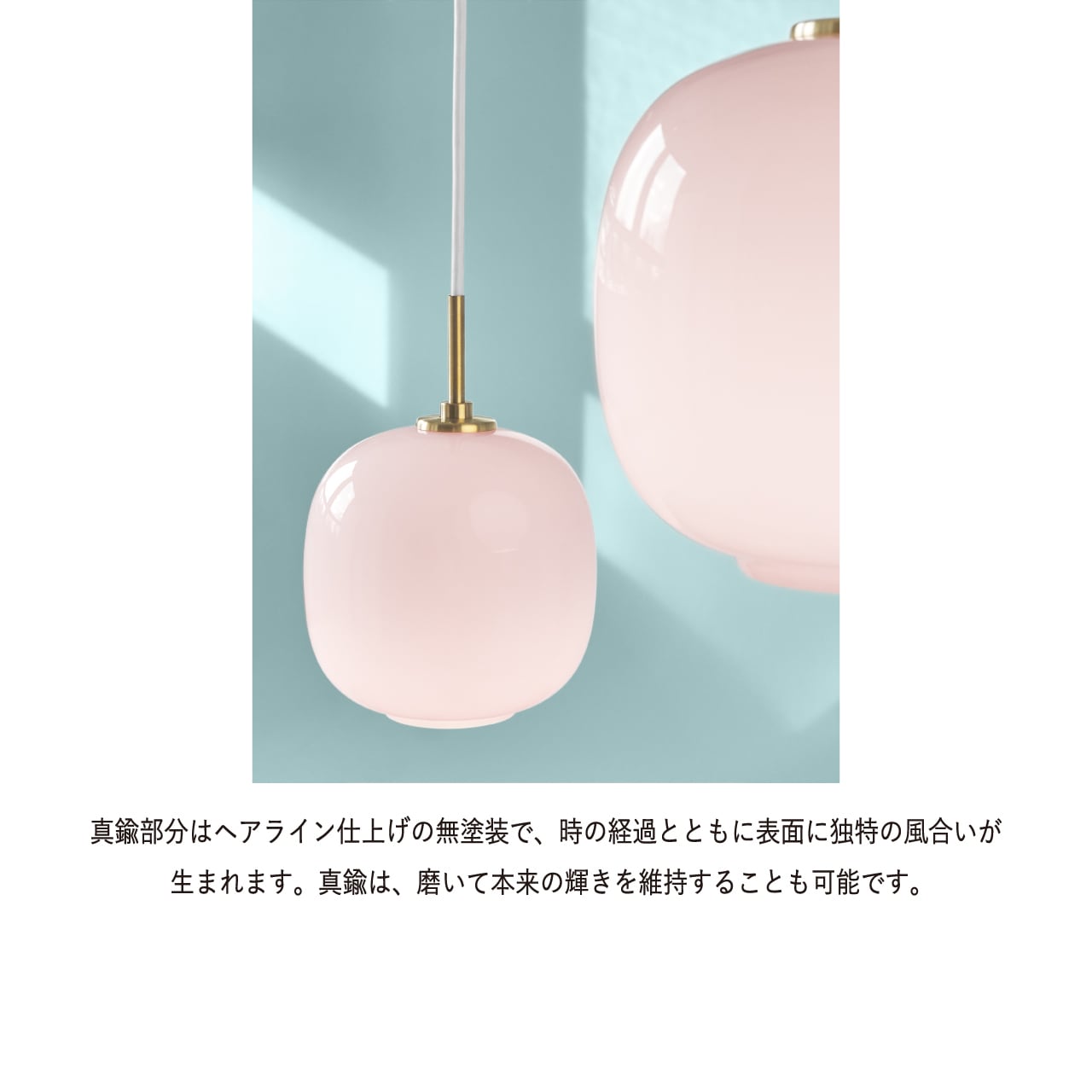 VL 45 ラジオハウス ペール・ローズ ペンダントには、アイコニックなデザインへの新しさとして、ペールローズ色のガラスシェードを採用し、現代のインテリアトレンドにさりげなくマッチする仕上がりとなっています。ペール・ローズのシェードはハンドメイドの吹きガラスで、その高い品質が美しい輝きを保証します。