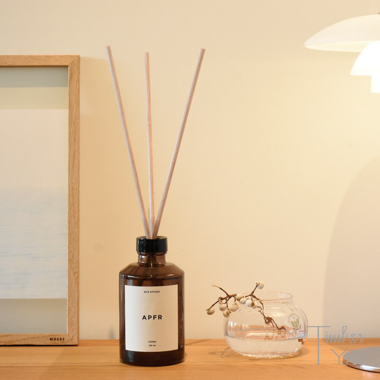 スティック(リード)が液体を吸い上げ、APFRの上質な香りをほのかに漂わせます。使用期間は約半年ですが、お部屋の広さなどに合わせてスティックをいれる本数を変えると半年以上お使いいただくこともできます。